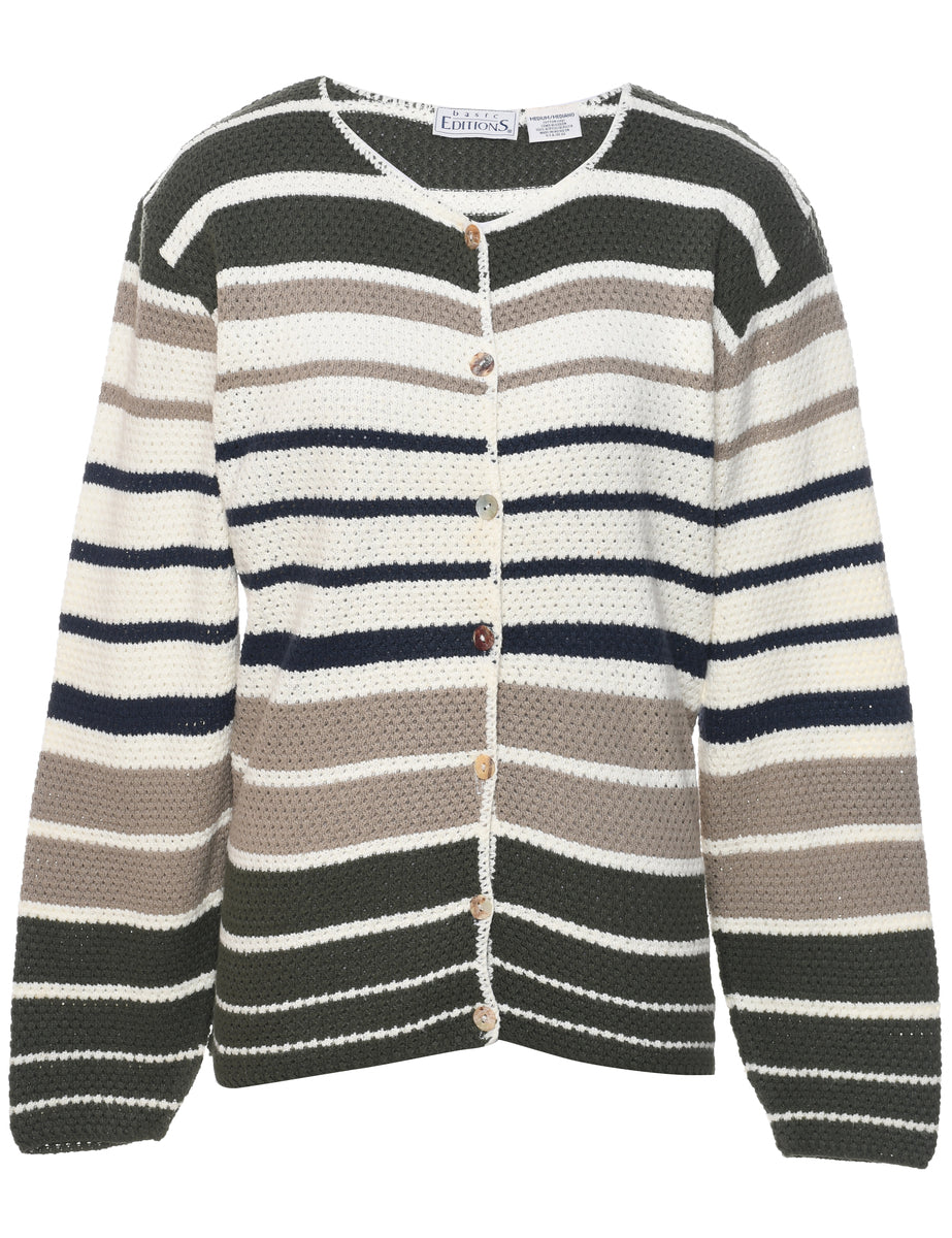 Button through cardigan with striped pattern comes in multi-colour with a round neck.