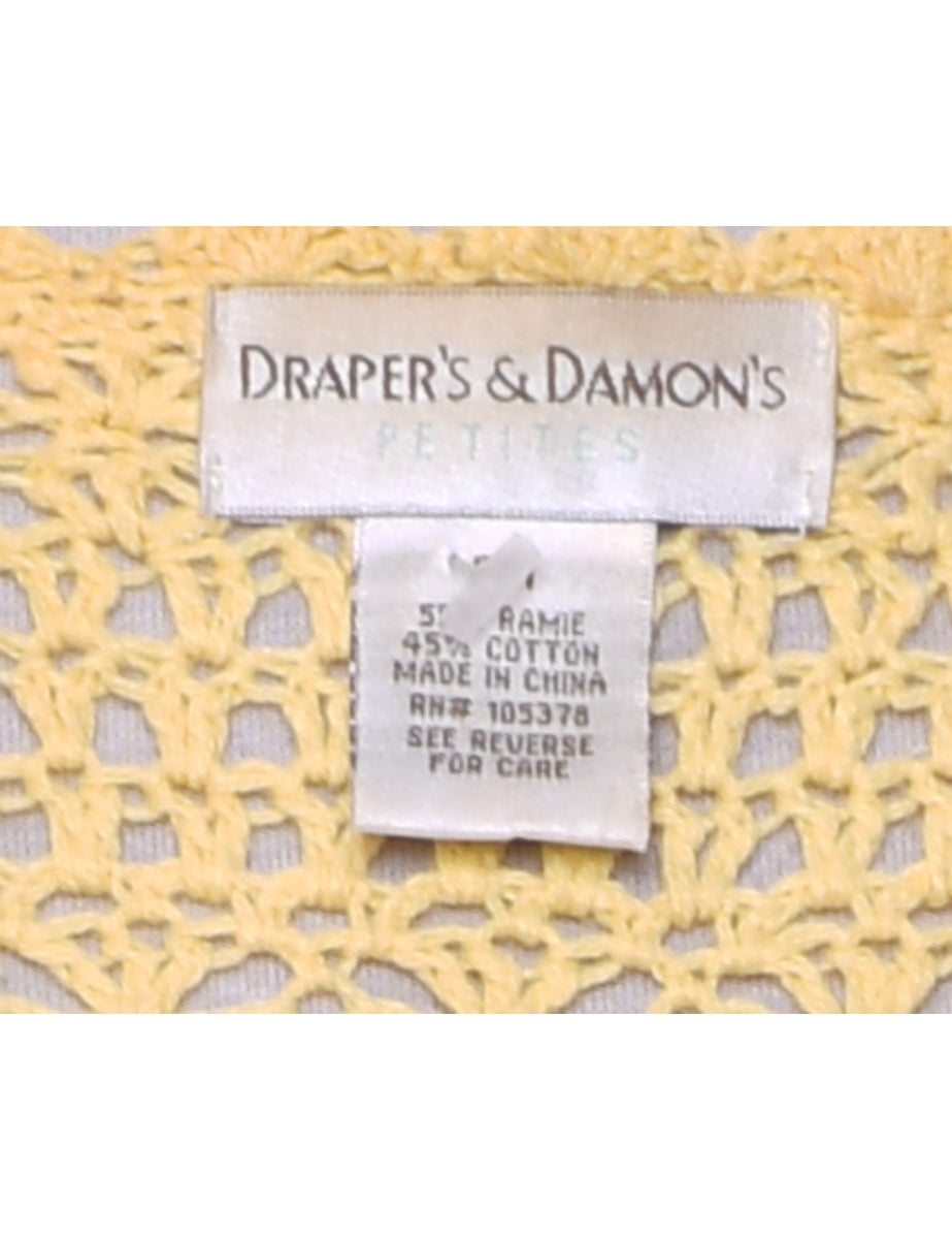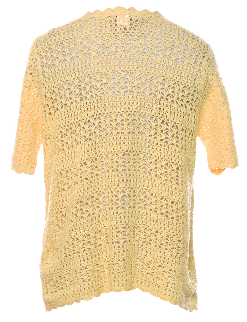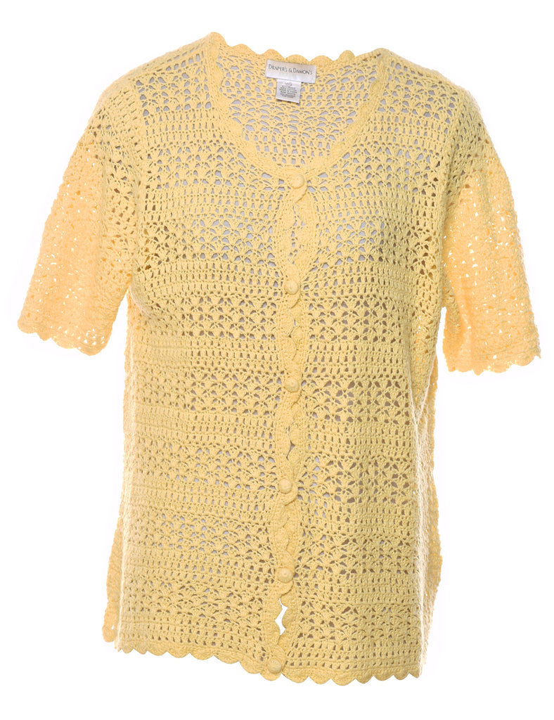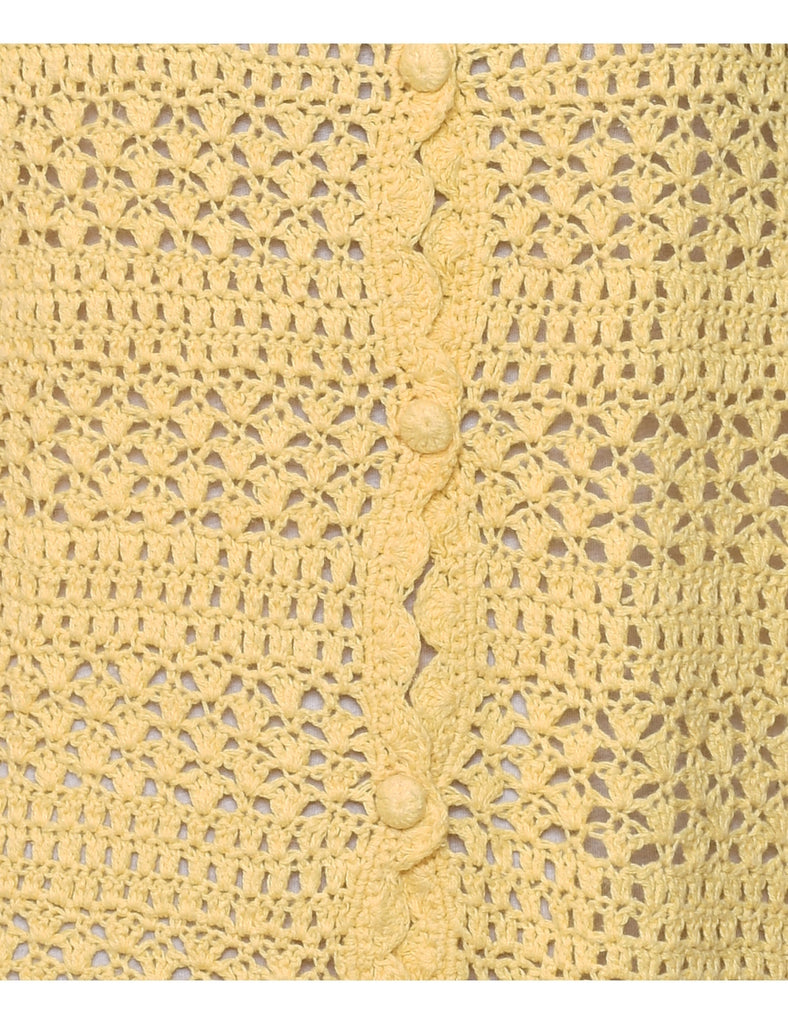 Classic cardigan with crochet. Comes in yellow with a scalloped hem.