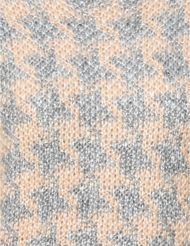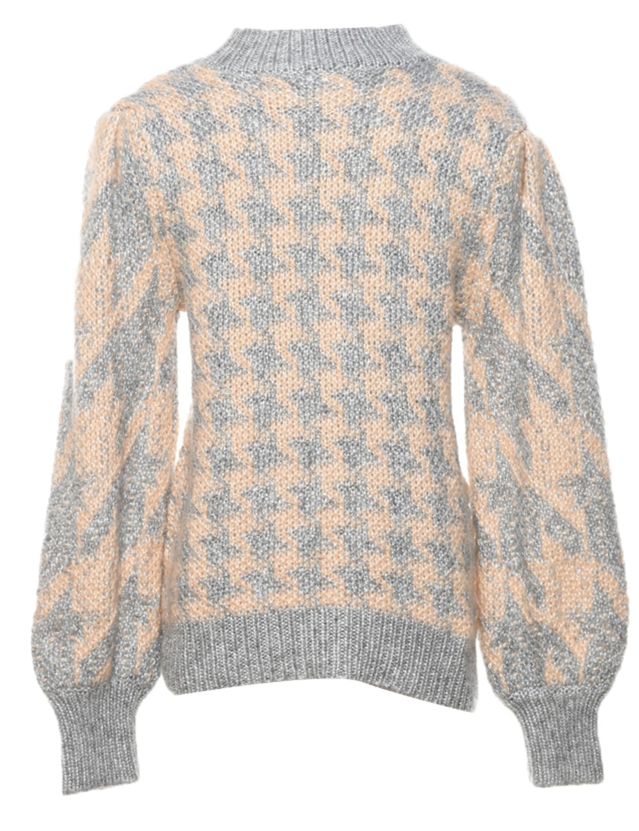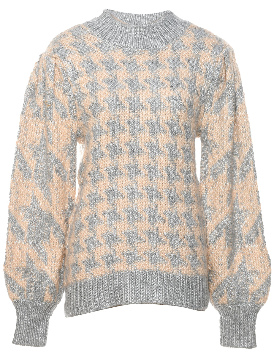 Cable knit jumper with dogtooth checks. Comes in coral & grey with a crew neck and puff sleeves.