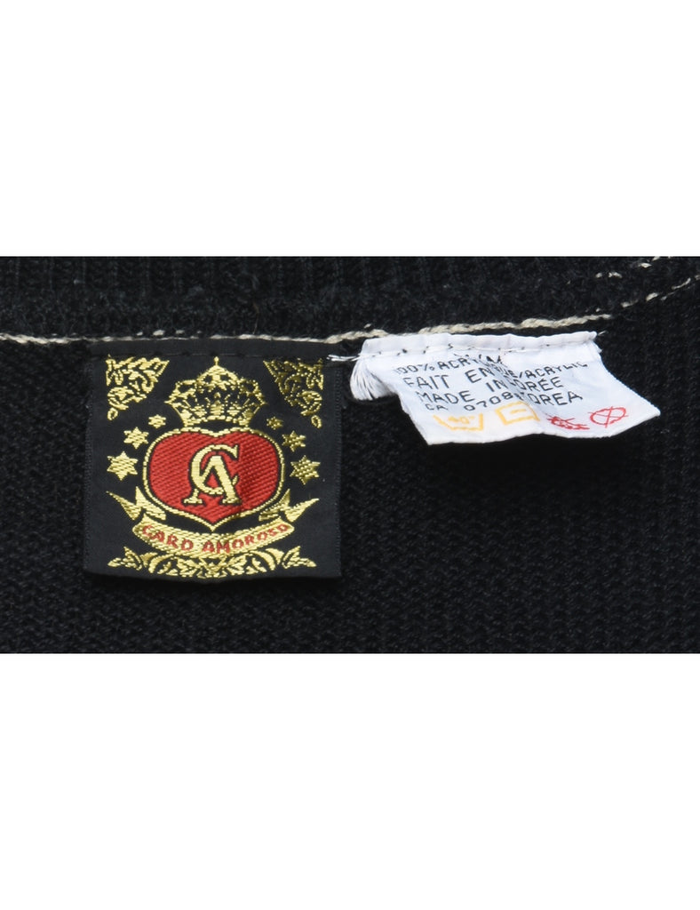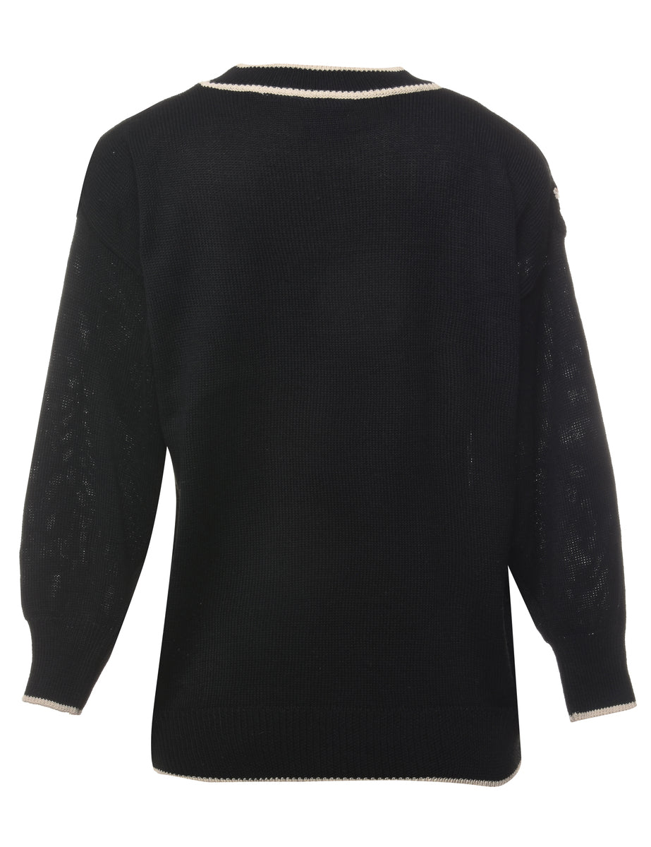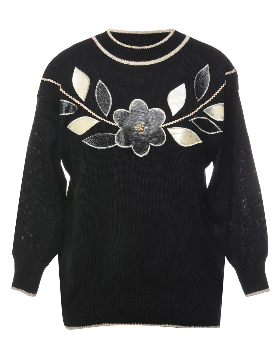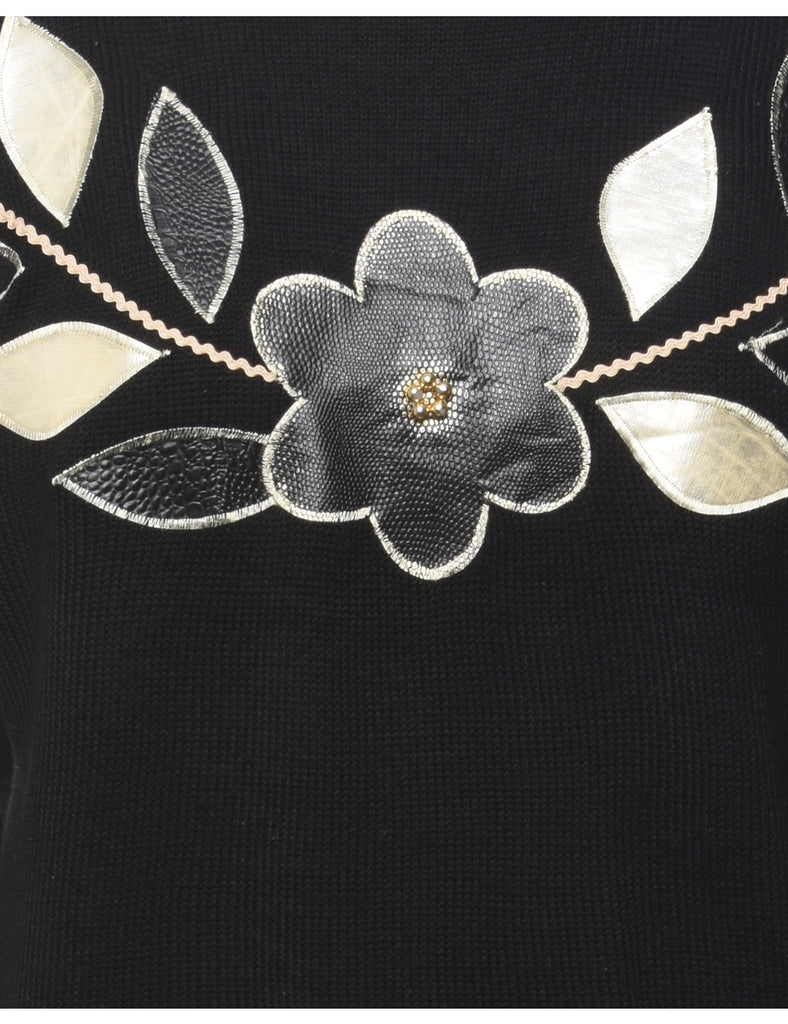 Floral knit jumper in black with patchwork leather detailing and removable shoulder pads.
