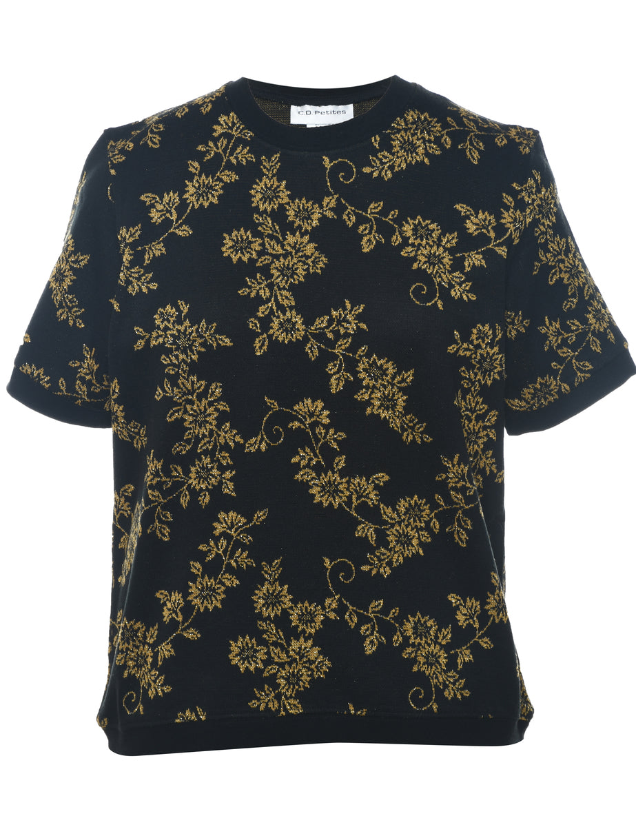 Floral knit jumper with lurex thread pattern. Comes in black with a round neck.