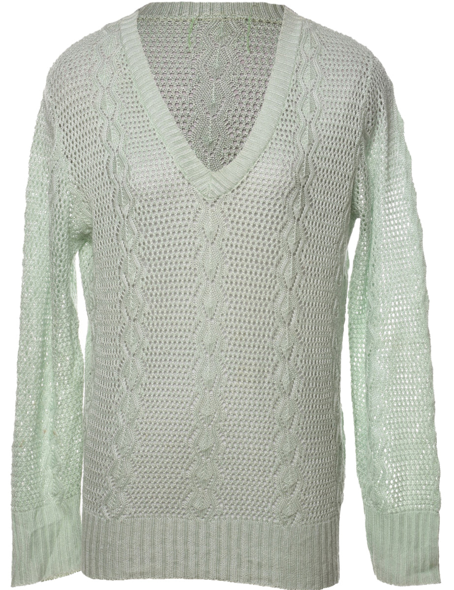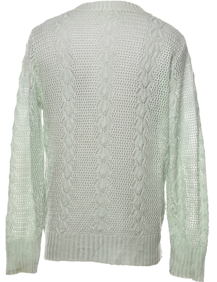 Classic fine knit jumper with crochet. Comes in light green with a v-neck.