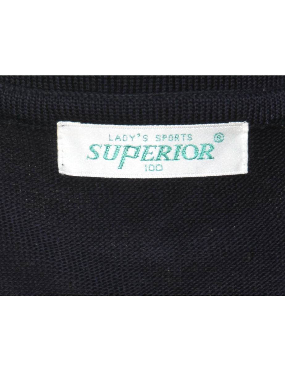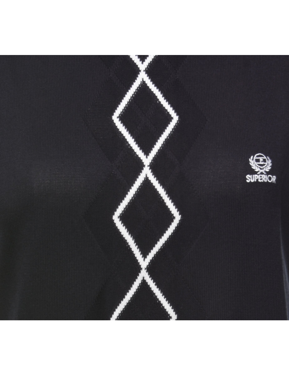 Argyle sweater vest in navy with contrasting trim.