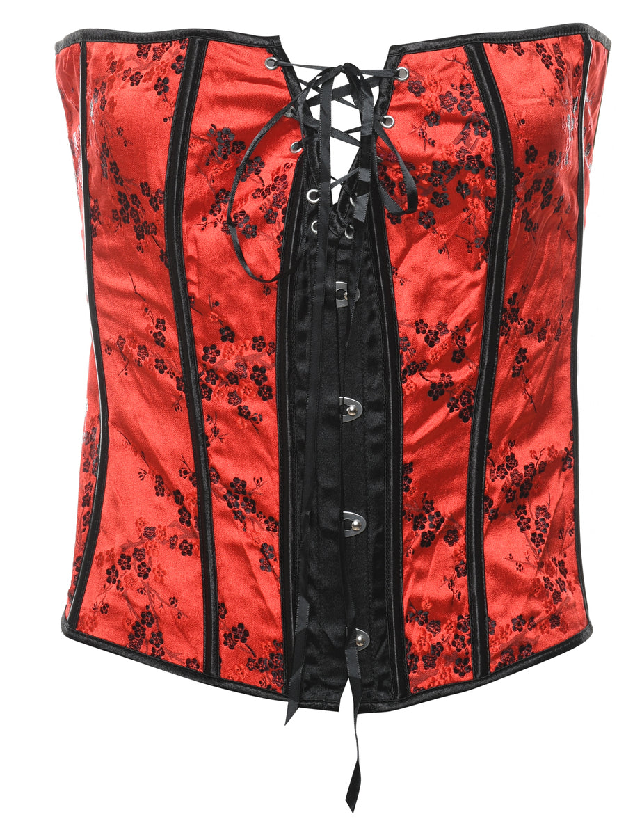 Classic corset in red with a boned bodice and lace trim. The size label mentions XL but based on the actual measurements we consider it a size S.