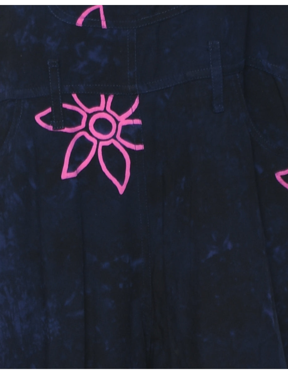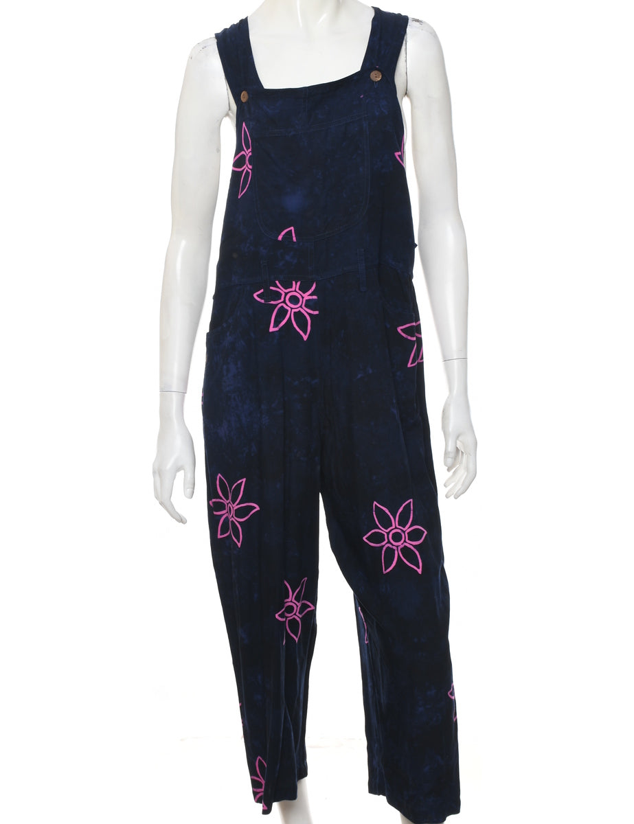 Floral pattern jumpsuit in navy with adjustable straps and multiple pockets.