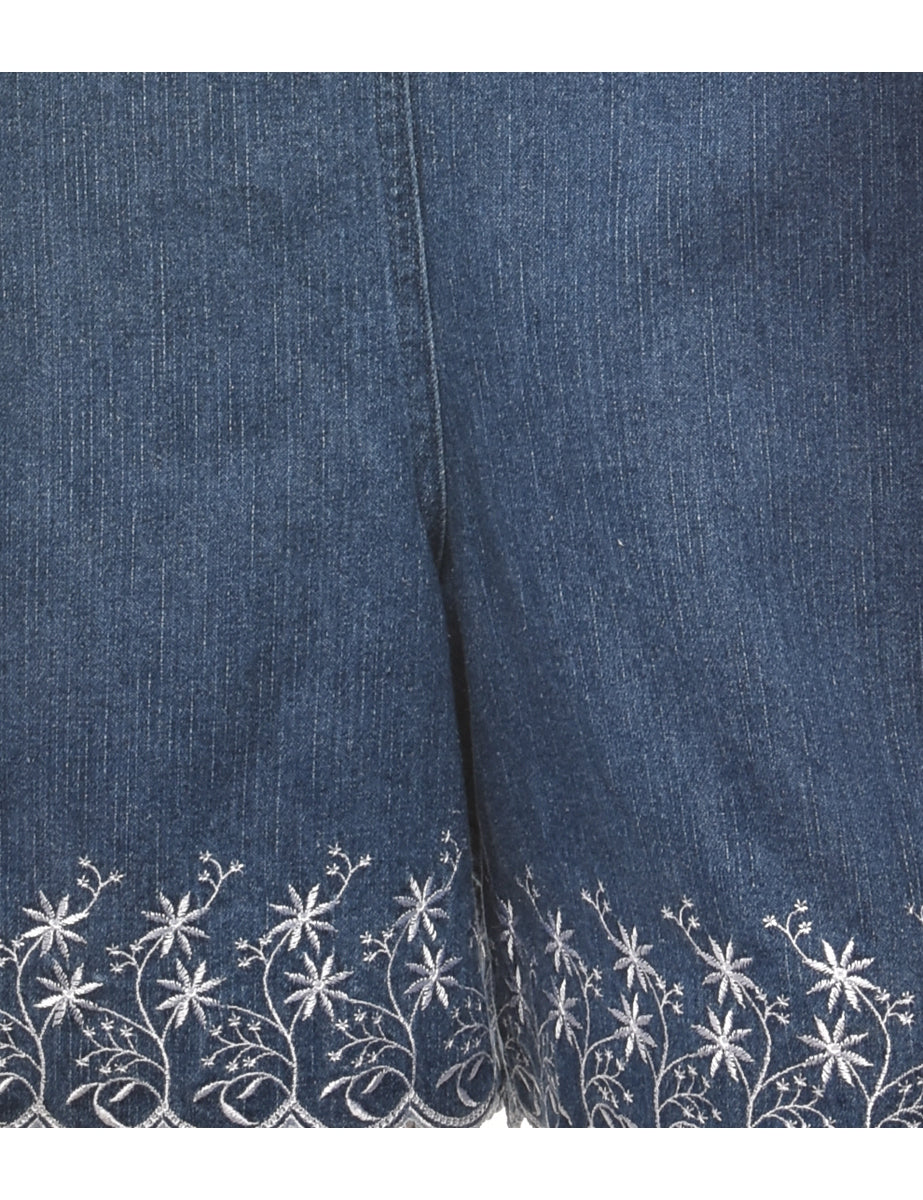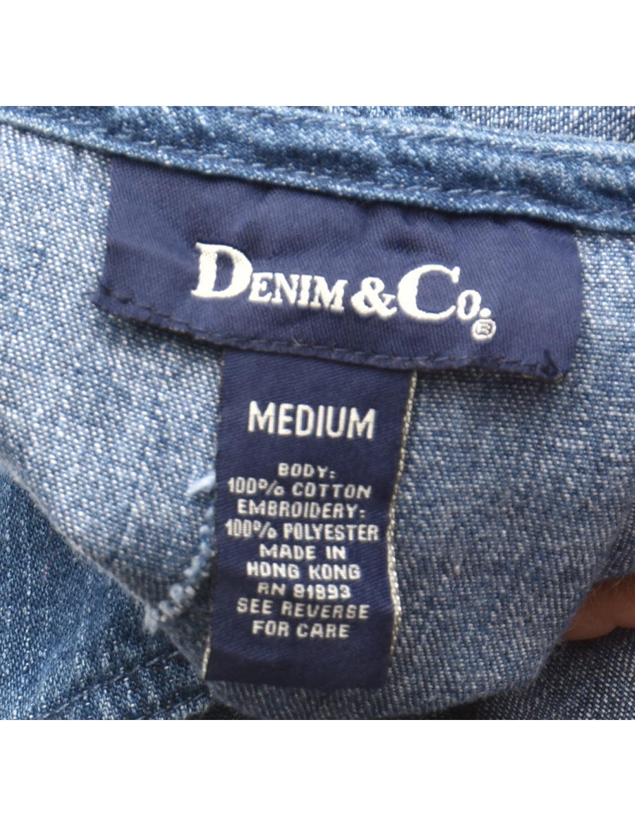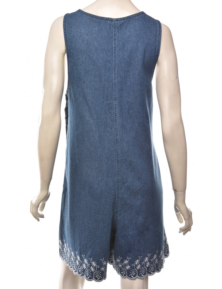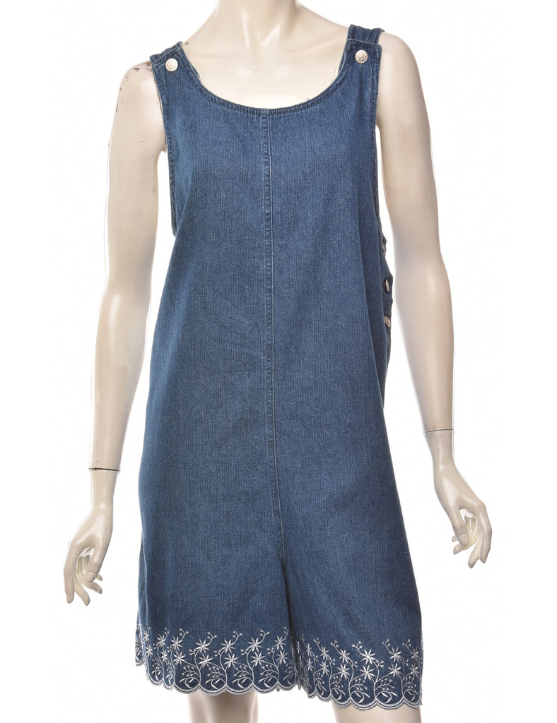 Denim playsuit from the 2000s in indigo with buttons on the shoulder and embroidery.
