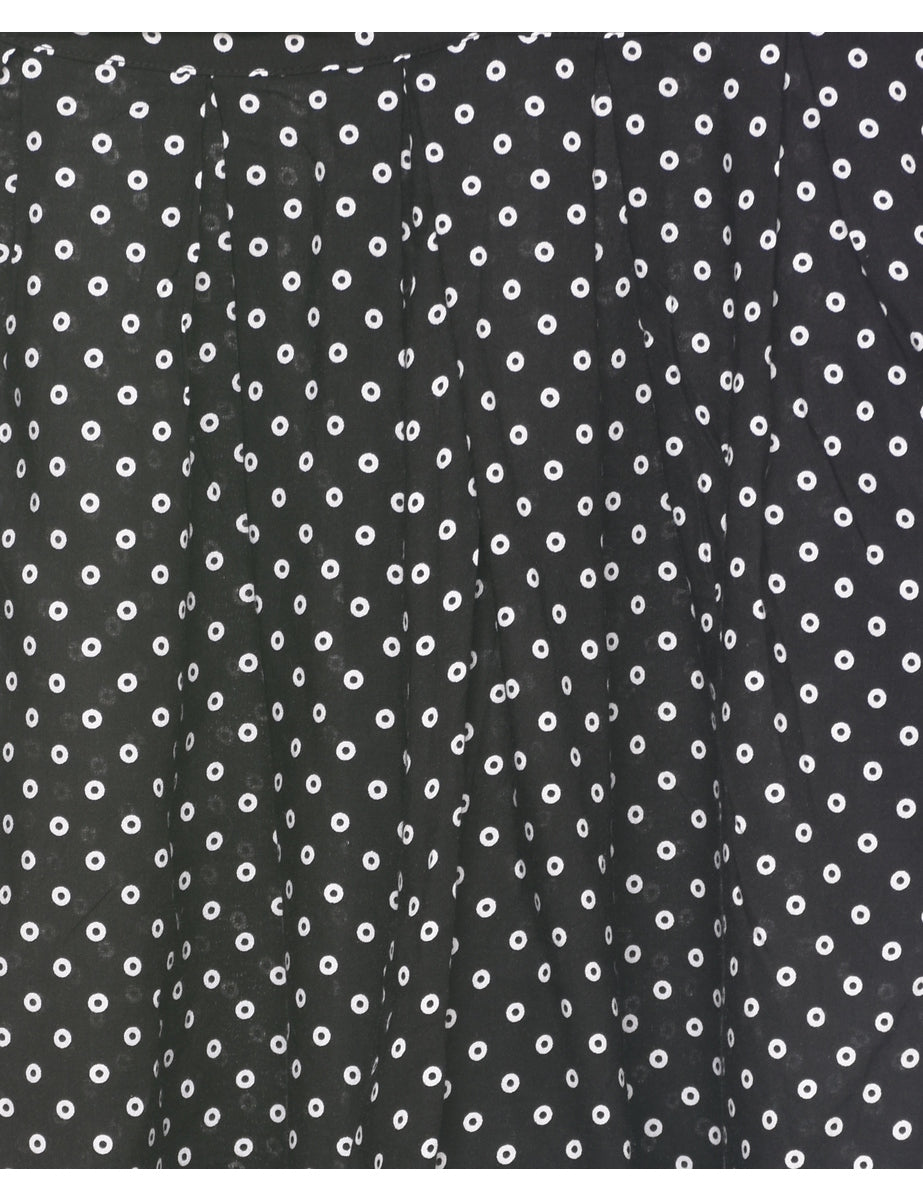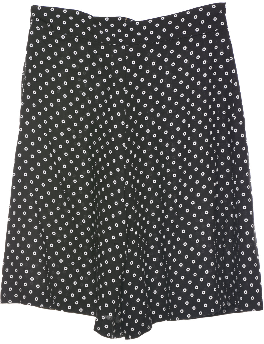 Spot print black shorts with pleating and one pocket.