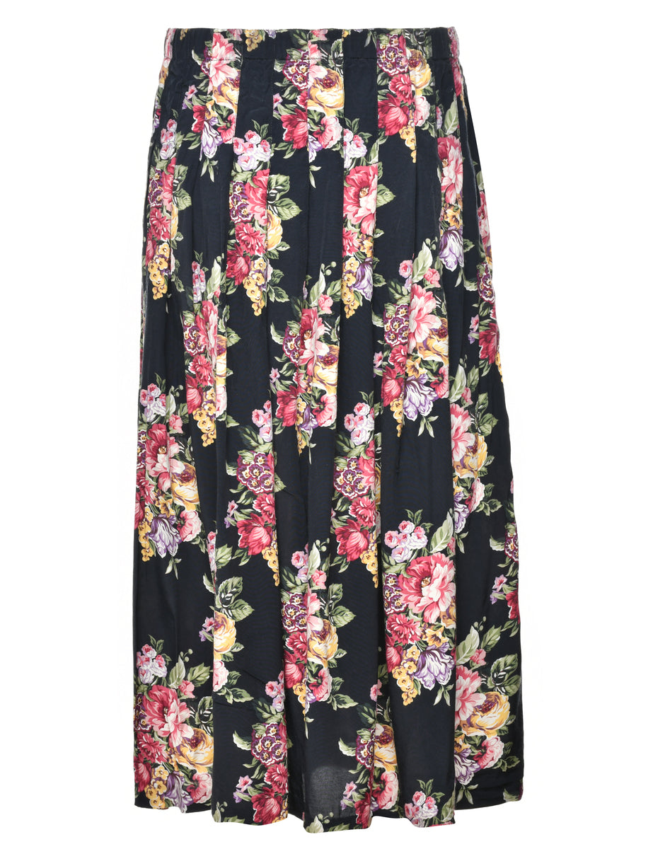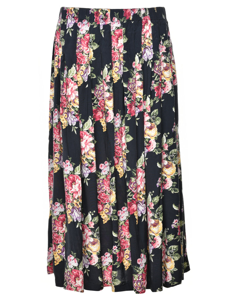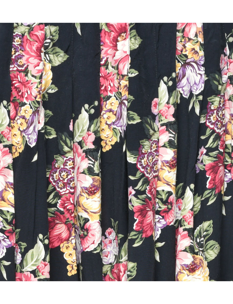 Floral print pleated skirt. Comes in black with two pockets and an elasticized waist.