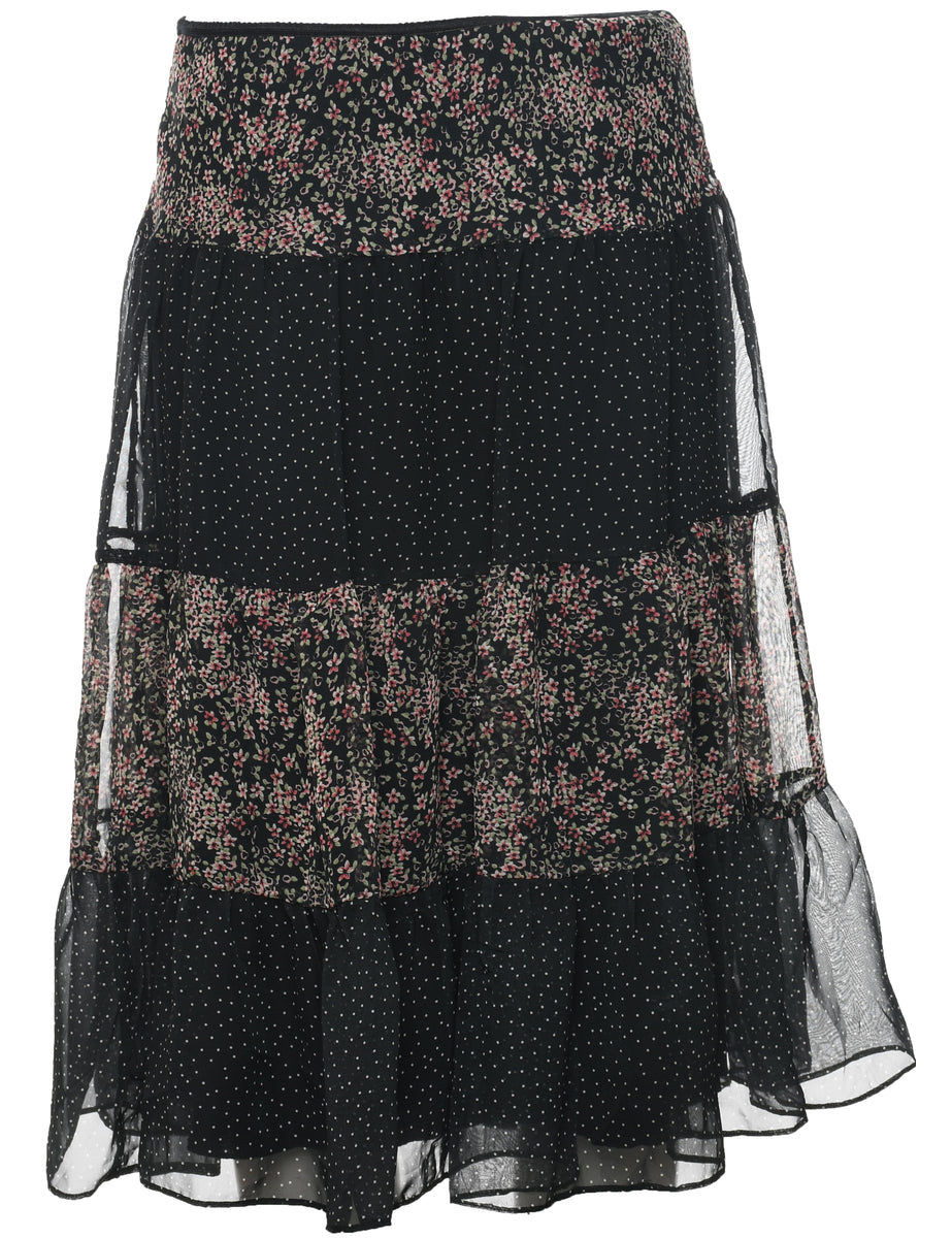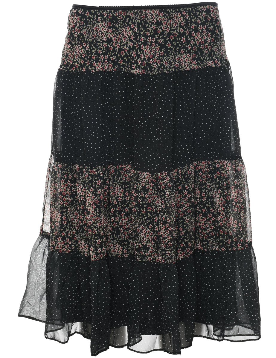 Polka dot flared skirt in black with ruched detailing and an elasticized waist.