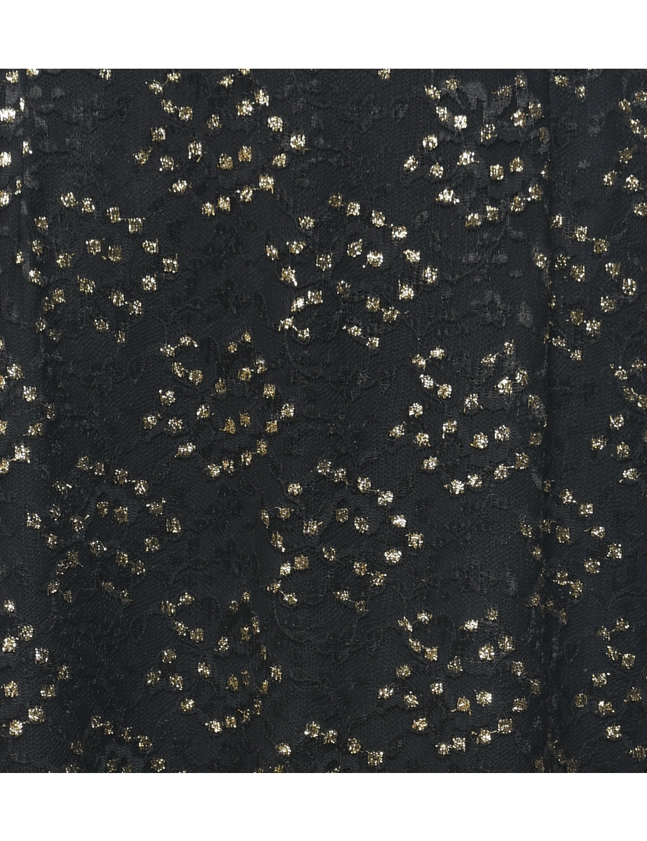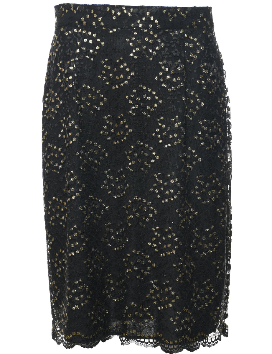 Floral pattern pencil skirt in black with lace, a scalloped hem.