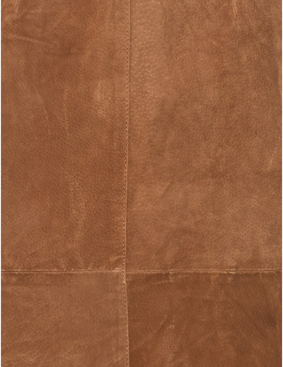 Suede pencil skirt in brown with an elasticized back and slit.