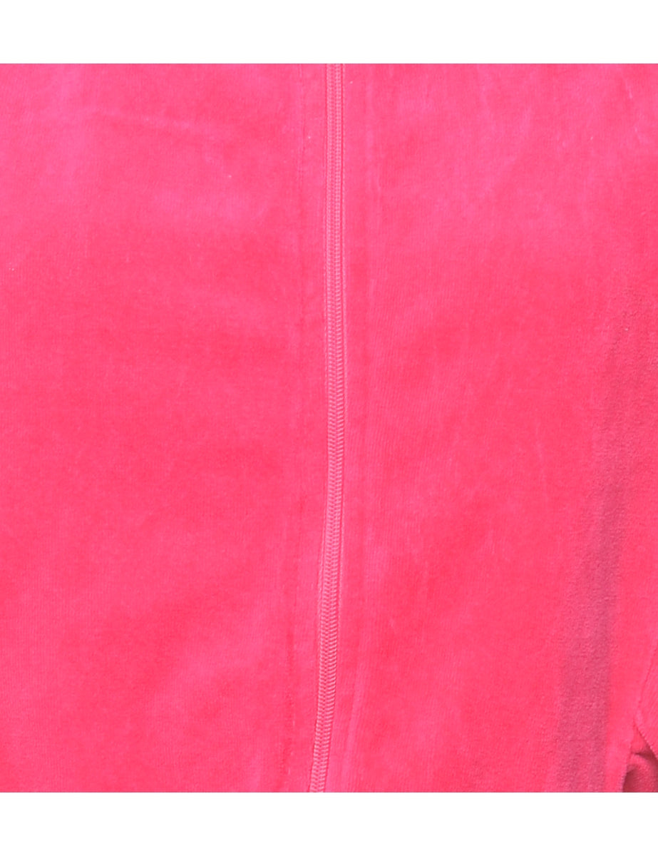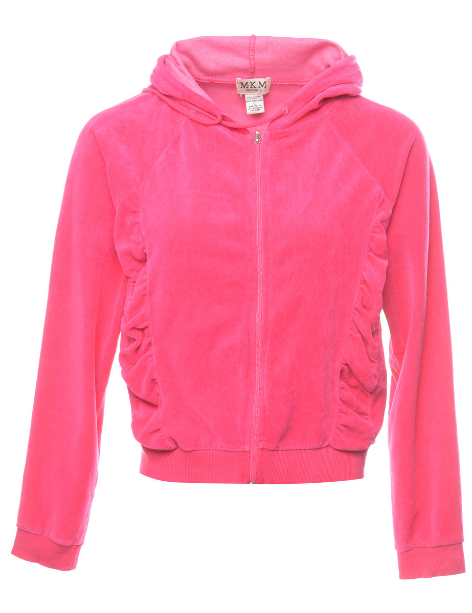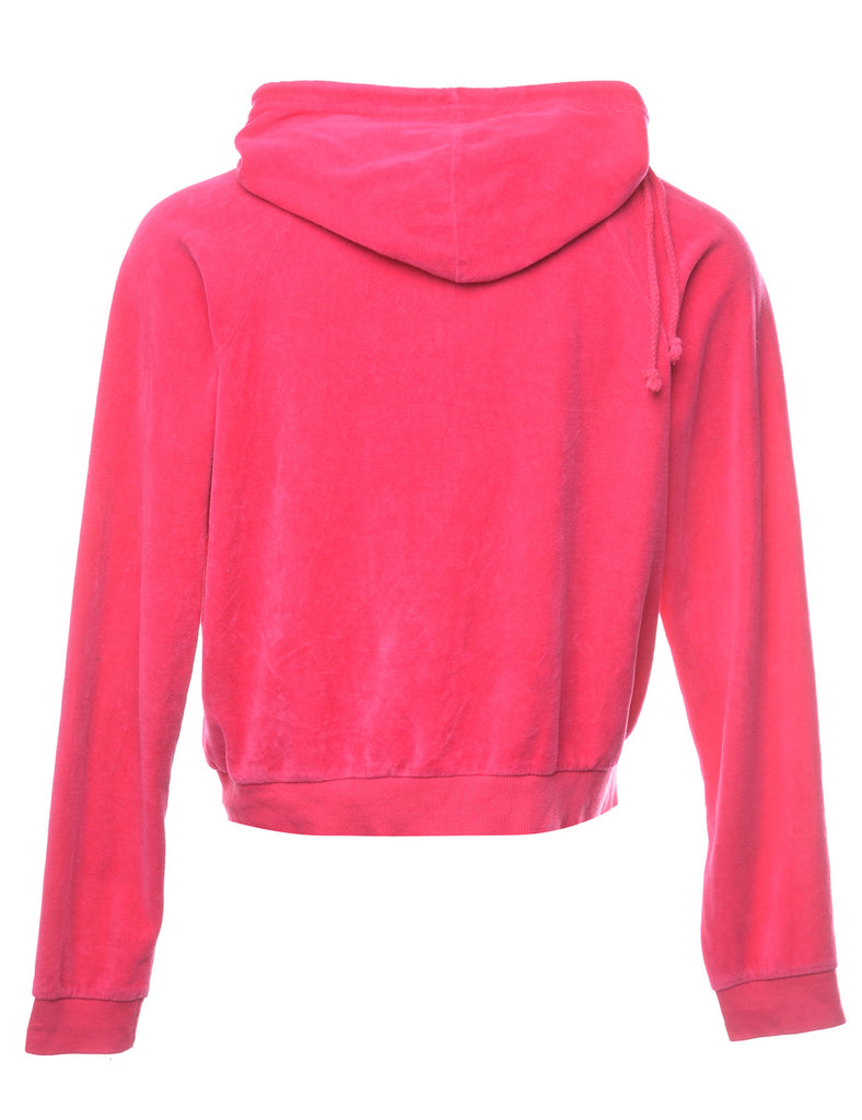 Velvet hooded sweatshirt comes in pink with a drawstring neck and raglan sleeves.