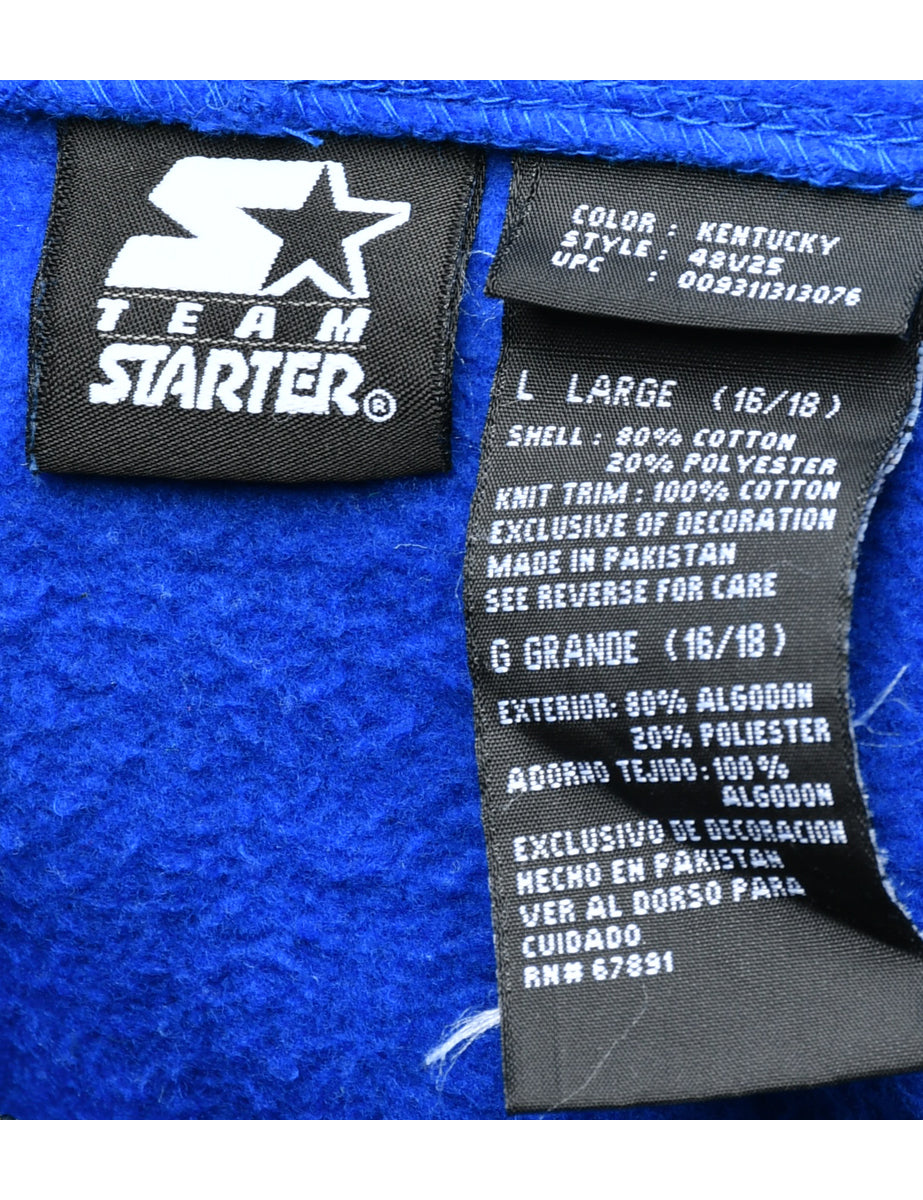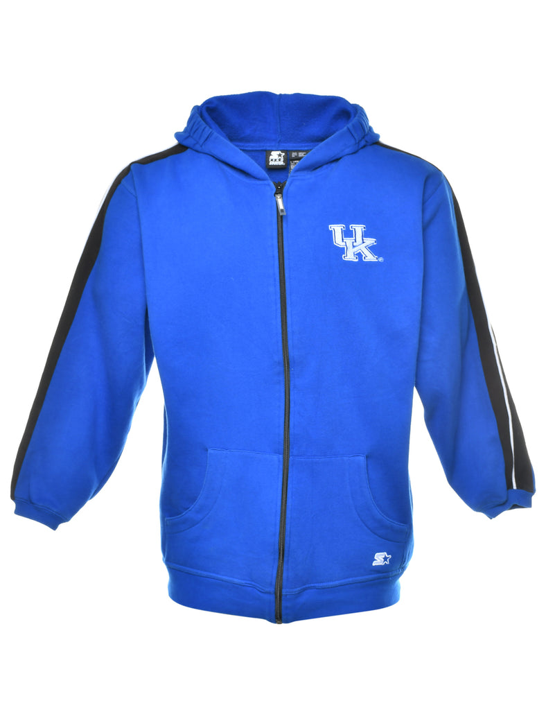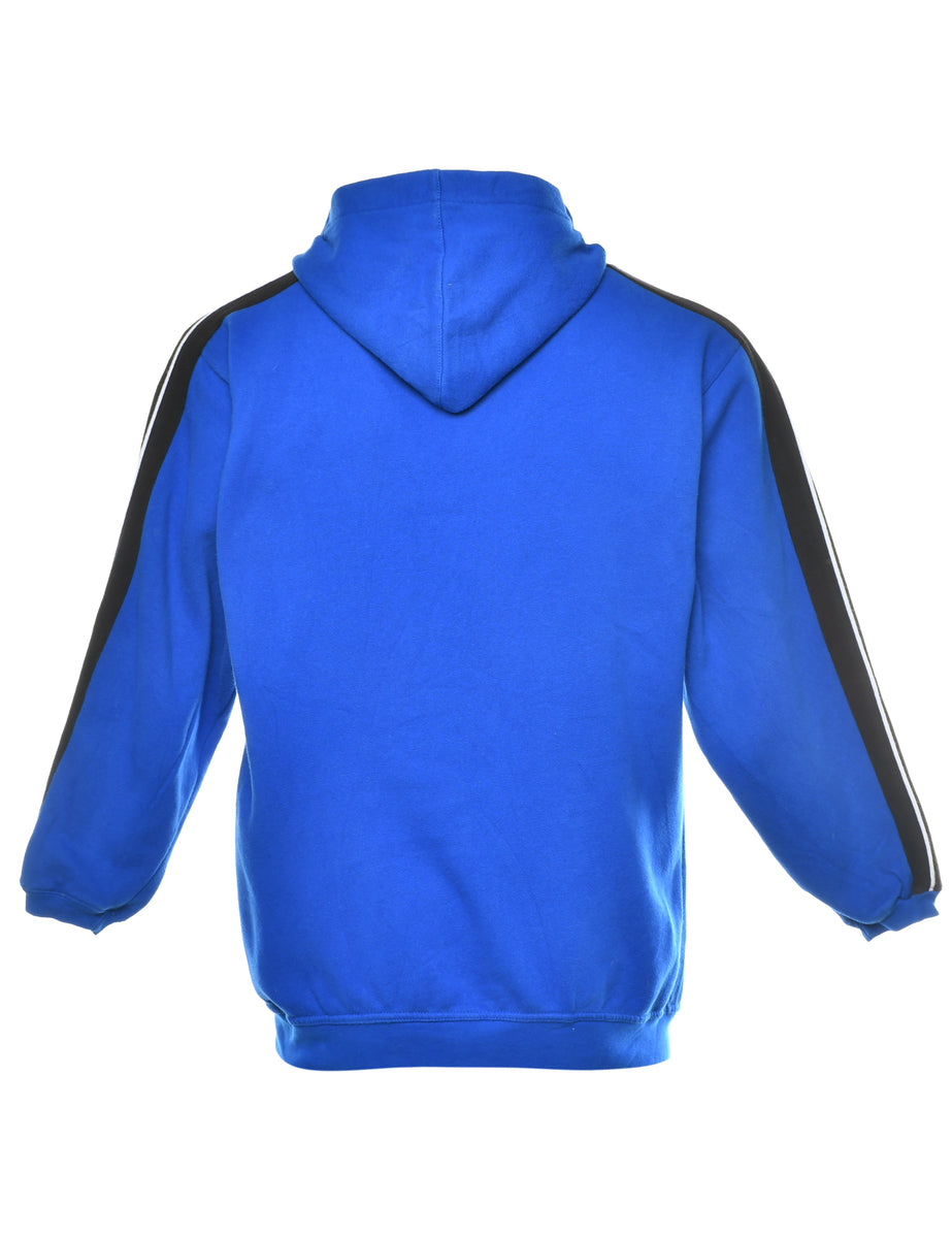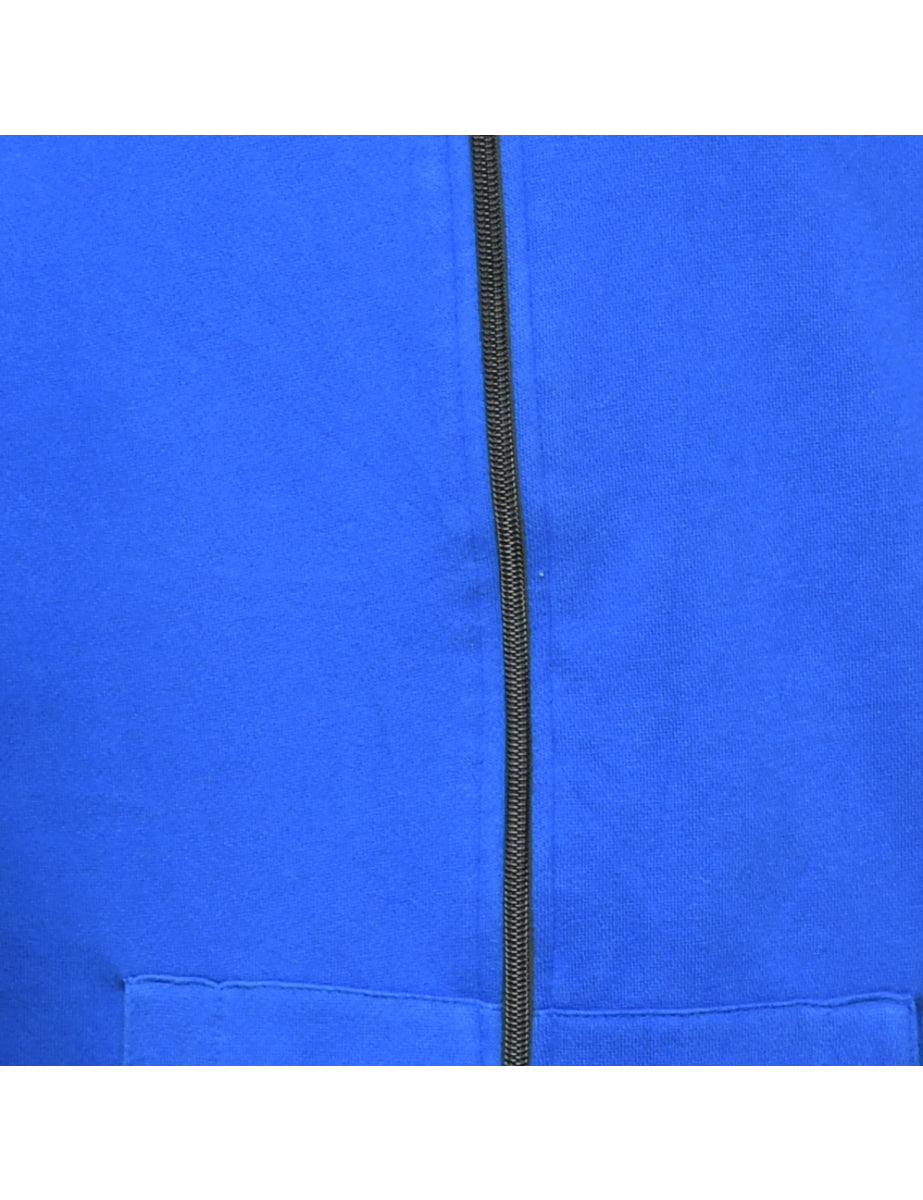 Zip front hooded sweatshirt comes in blue with two pockets and contrasting trim.