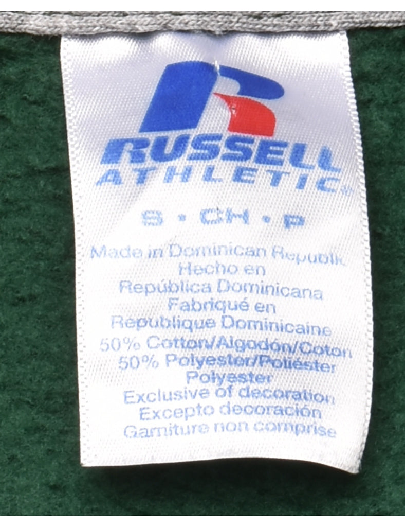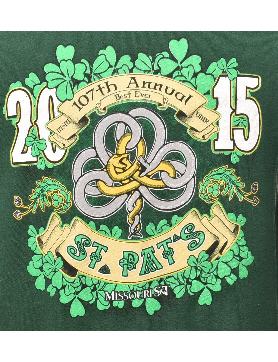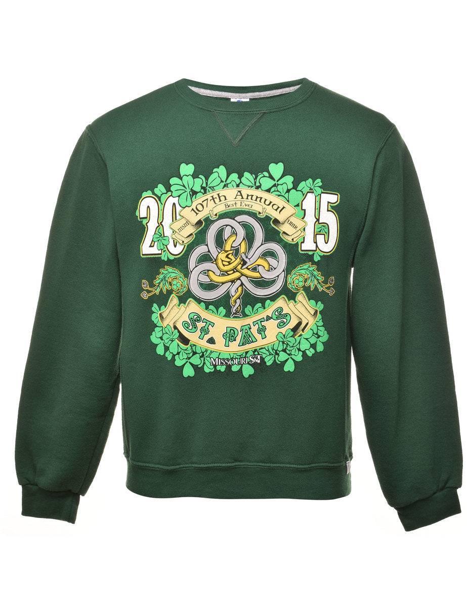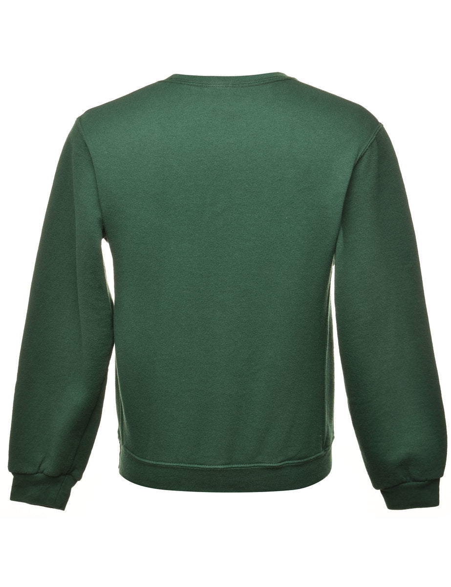 Printed sweatshirt. Comes in dark green with ribbed cuffs and waistband.