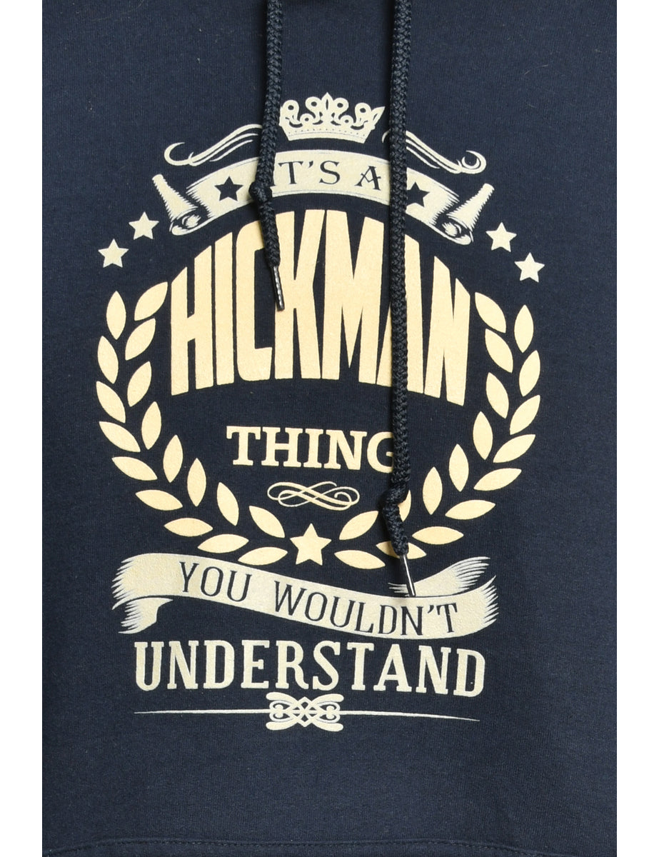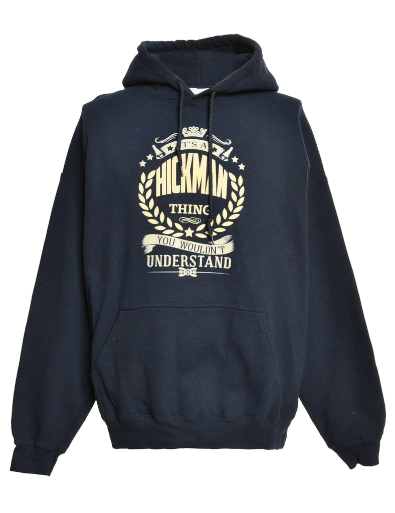 Hickman printed hoodie in navy with one pocket from the brand Gildan.