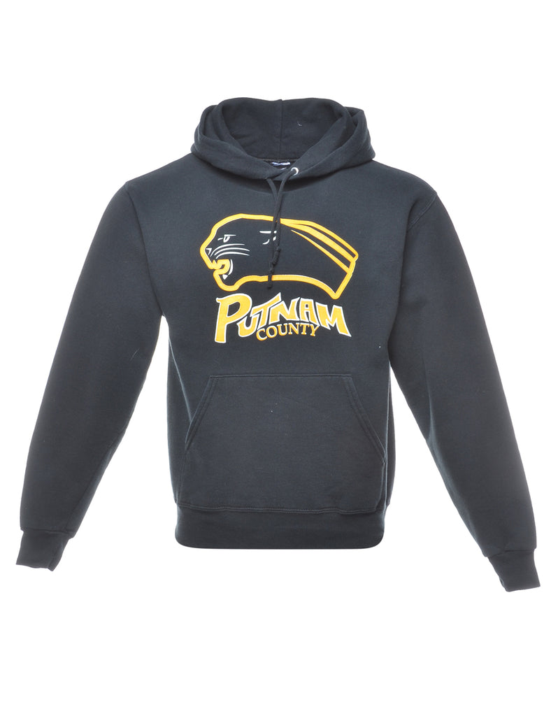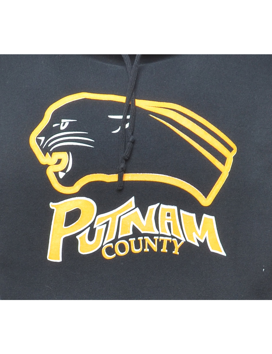 Putnam country printed hoodie. Comes in black with one pocket and ribbed cuffs and waistband.