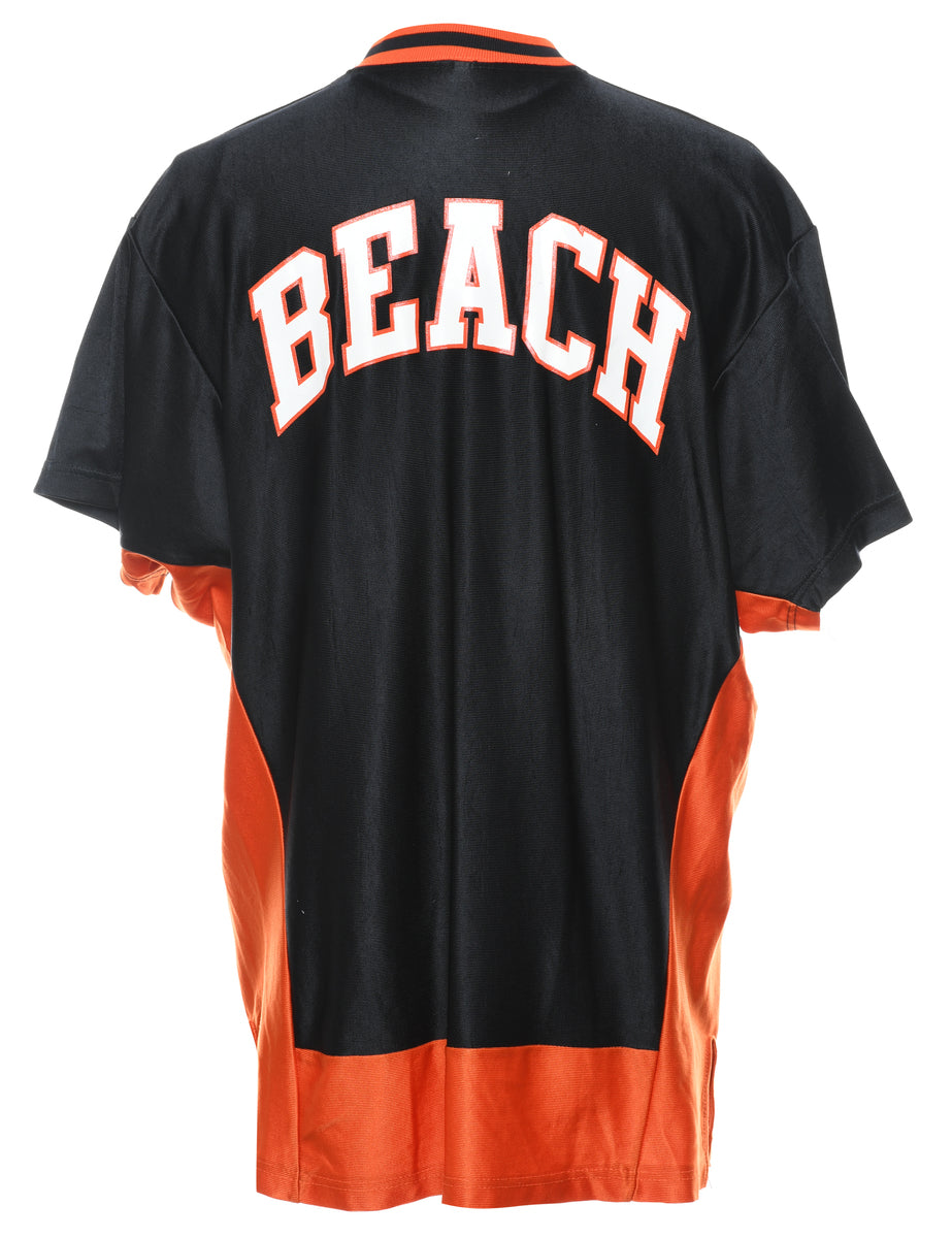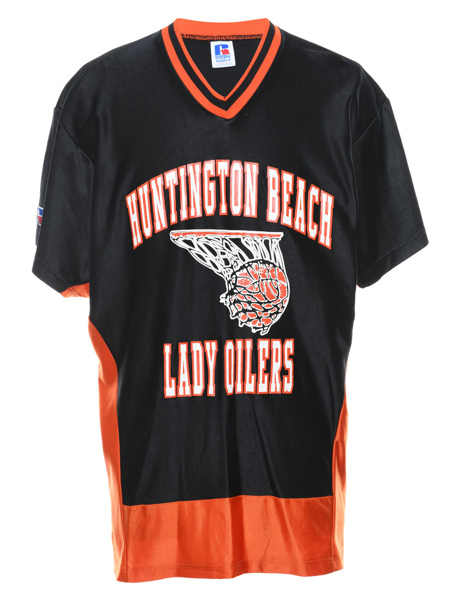 Lady Oilers Huntington Beach black & orange sports jersey complete with a v-neck.