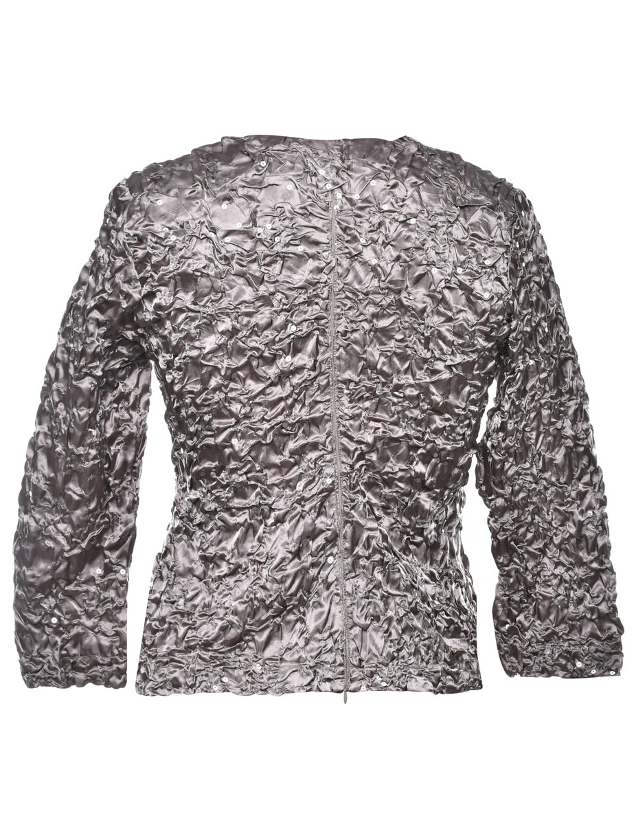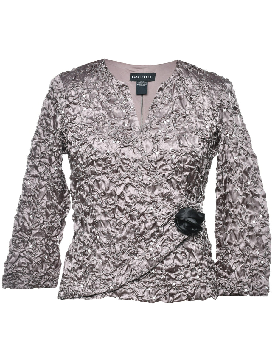 Crinkle evening top with sequins comes in brown with a pussy bow and removable shoulder pads.