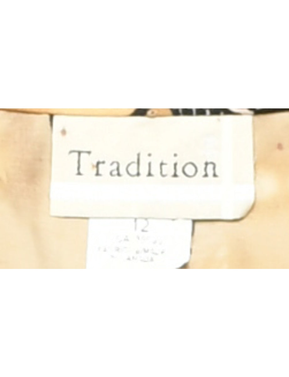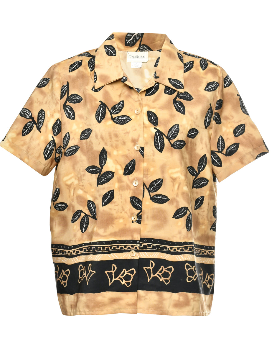 Short sleeve shirt with foliage print. Comes in brown with a classic collar and removable shoulder pads.