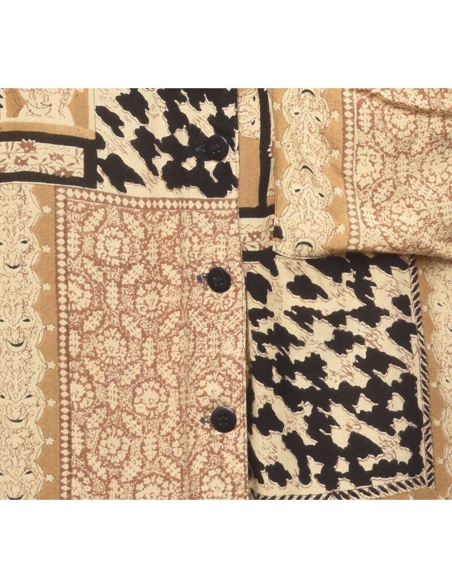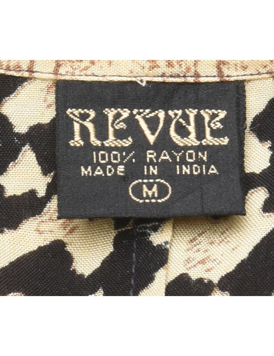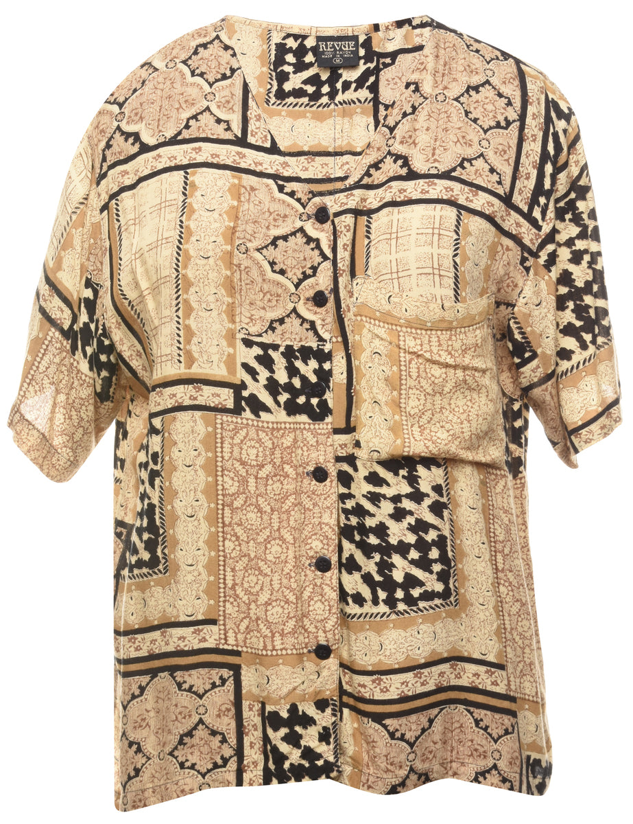 Short sleeve blouse comes in brown with a v-neck and a button front. The size label mentions M but based on the actual measurements we consider it a size XL.
