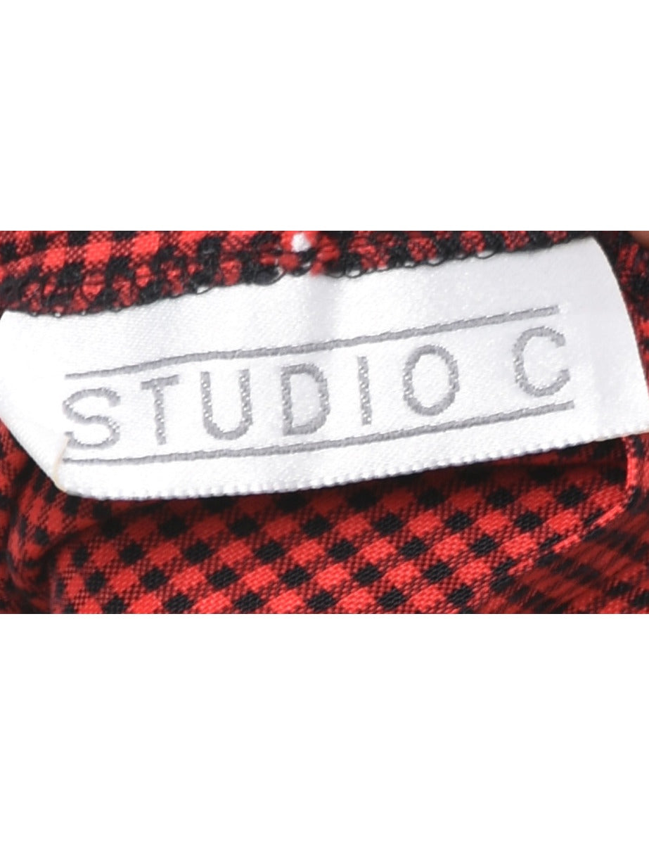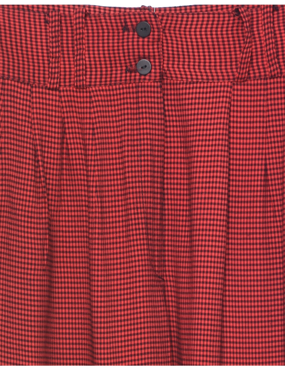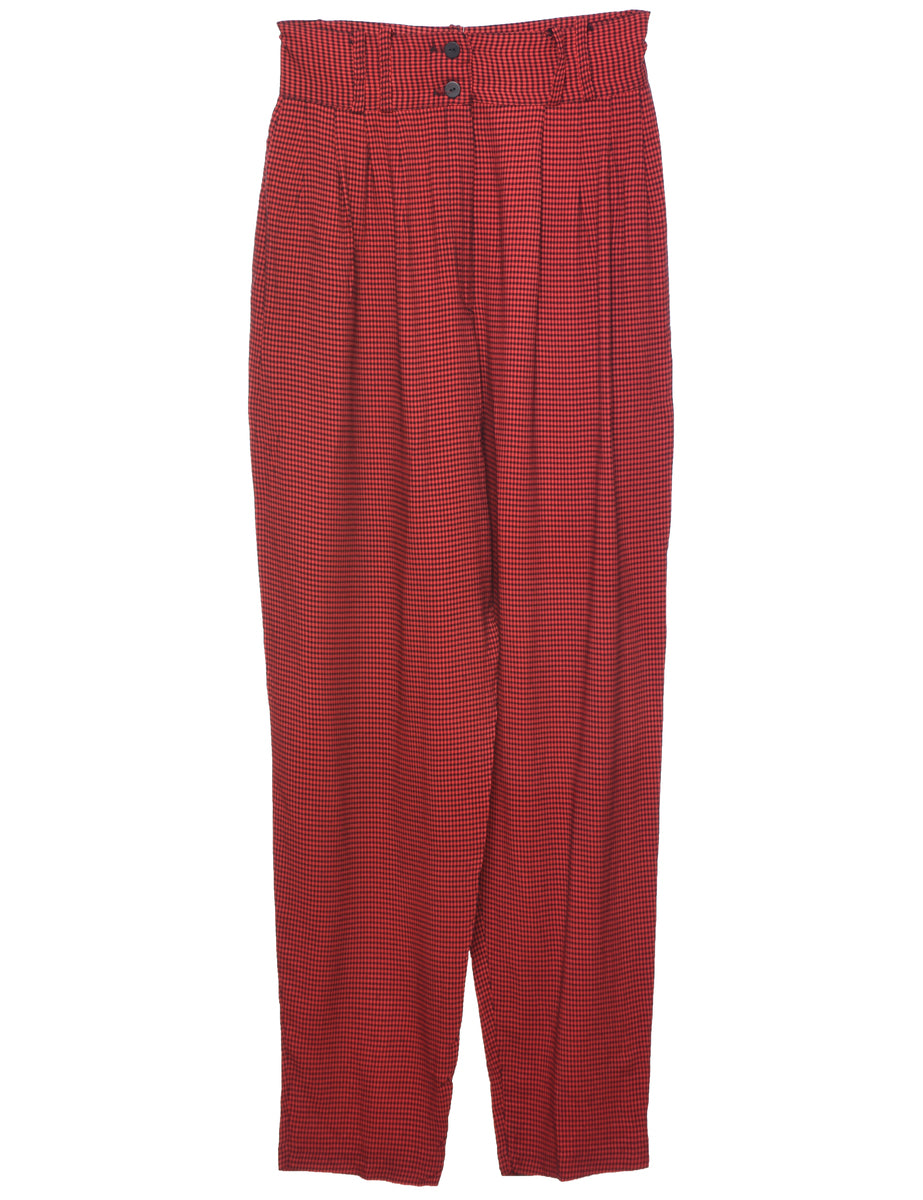 Checked printed trousers in red with pleat detail and multiple pockets.