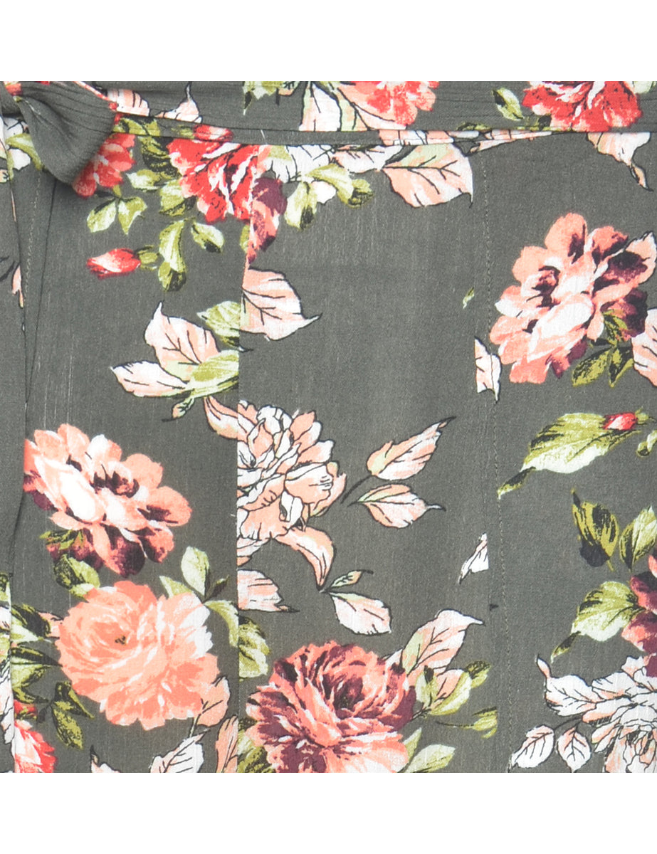 High waist harem pants with floral print. Comes in green with an elasticized back.