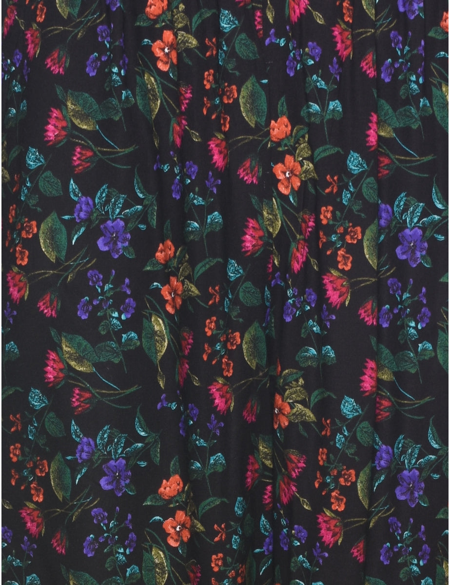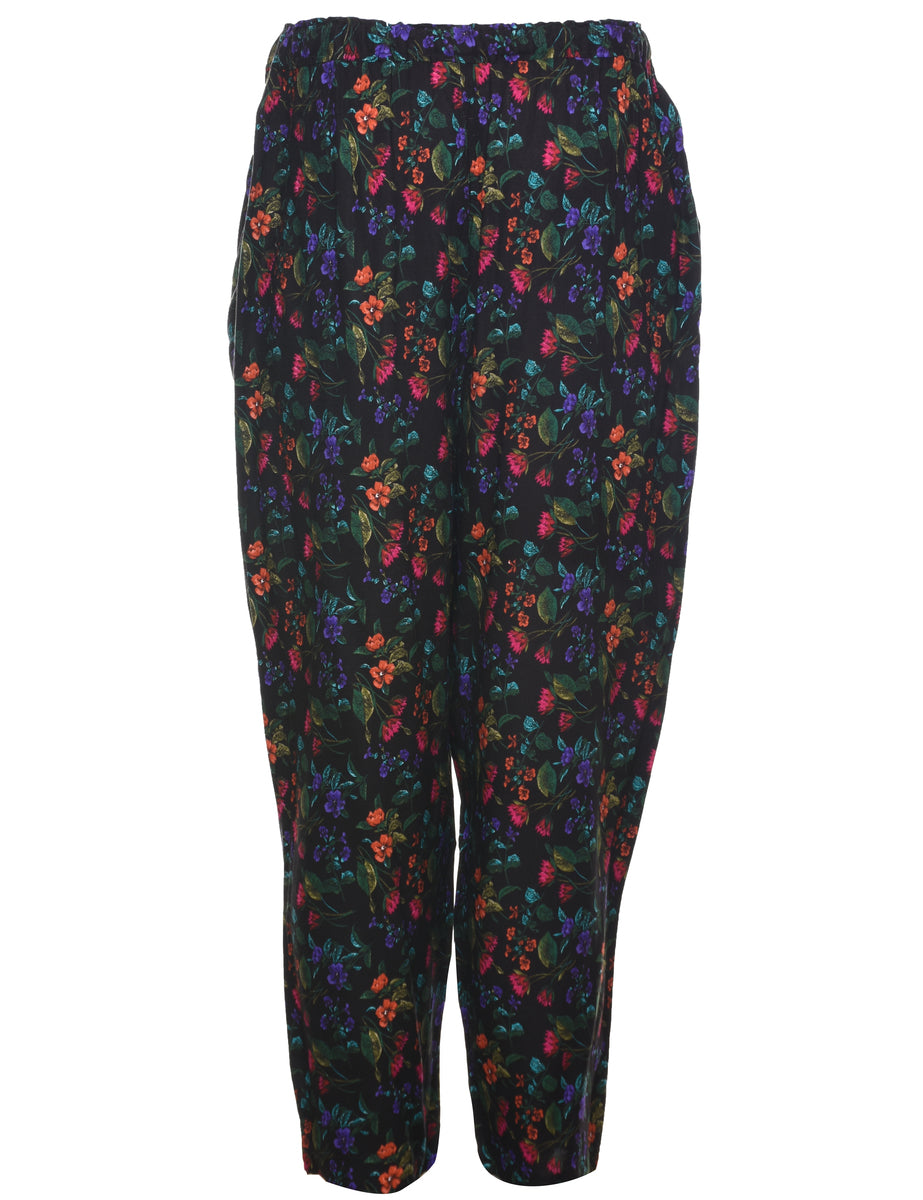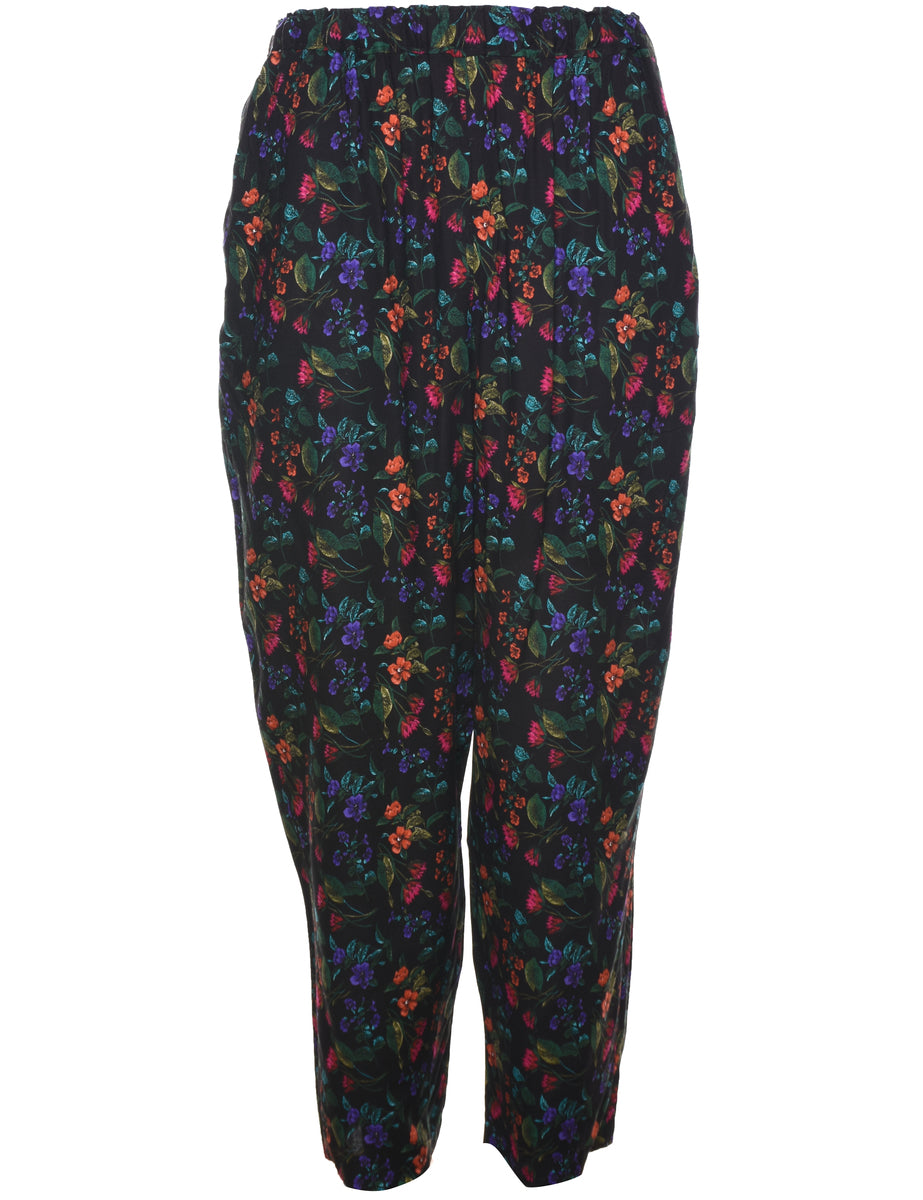Tapered trousers with floral print comes in black with multiple pockets and an elasticized waist.