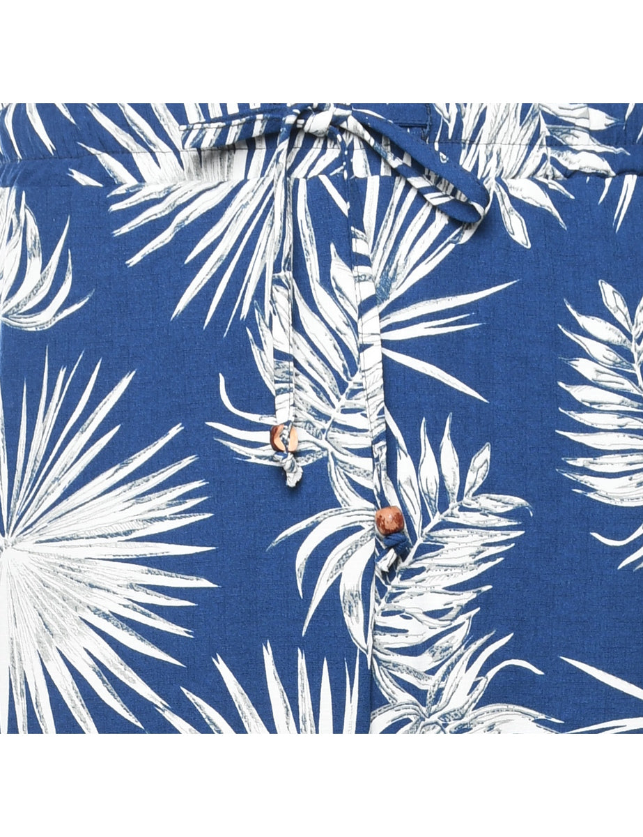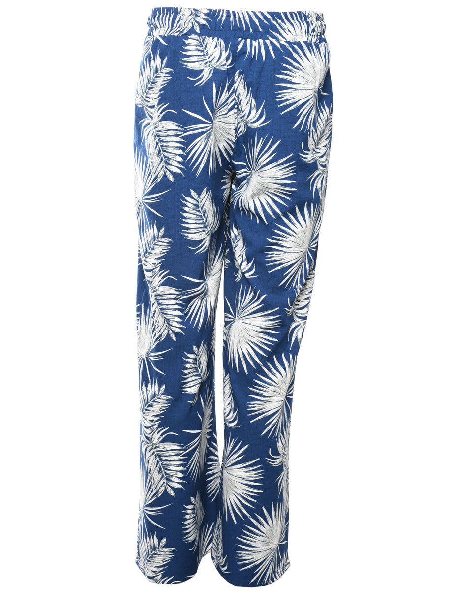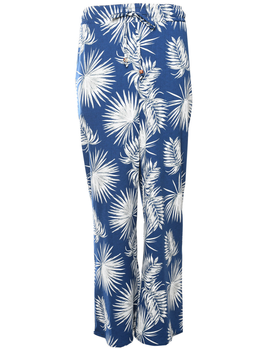 Tapered harem pants with foliage print. Comes in blue with full lining and a drawstring waist.