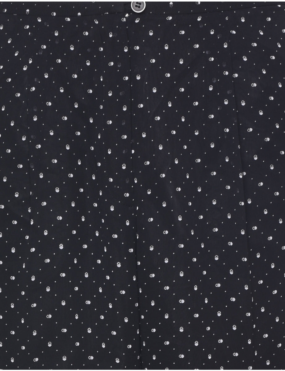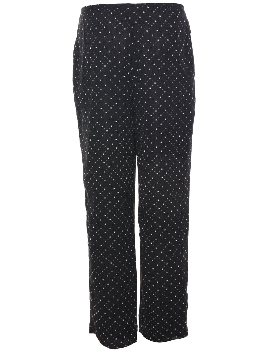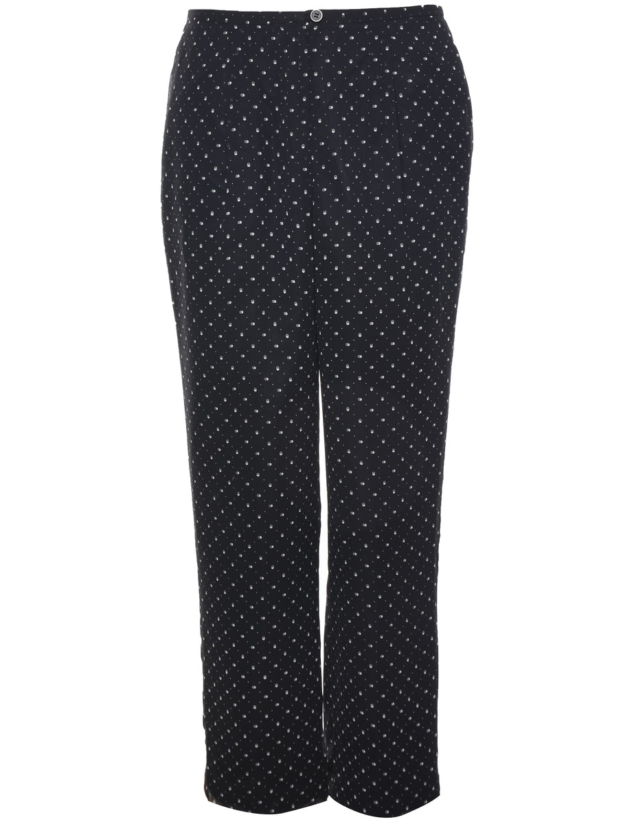 Tapered black printed trousers with pleat detail and multiple pockets.