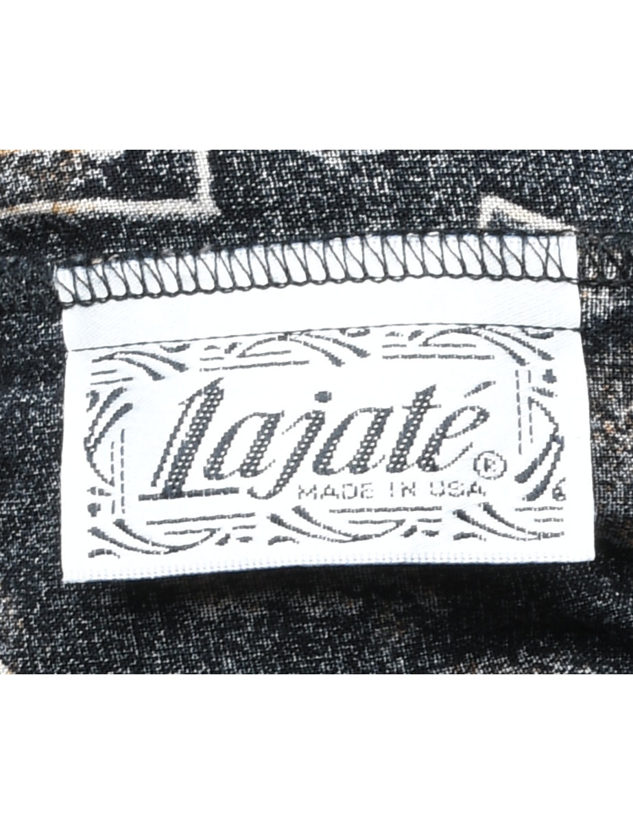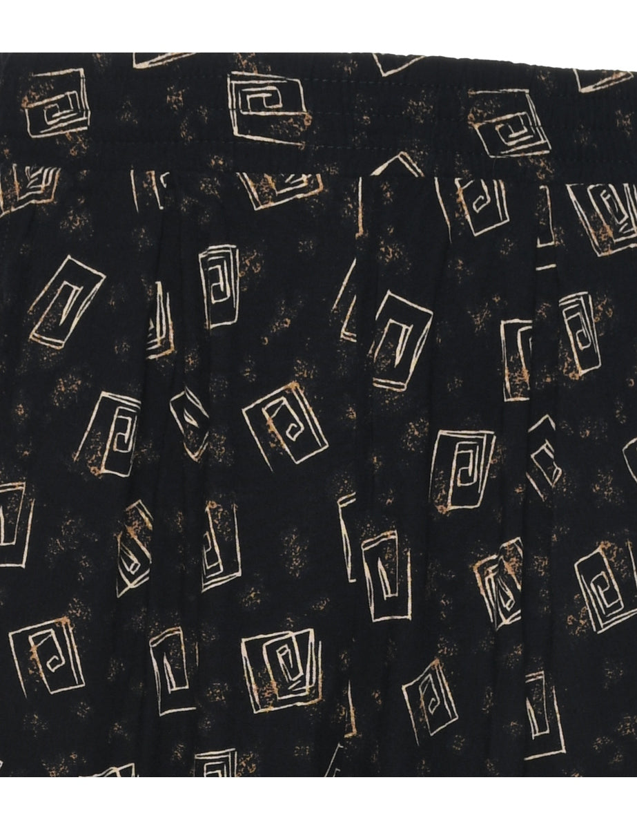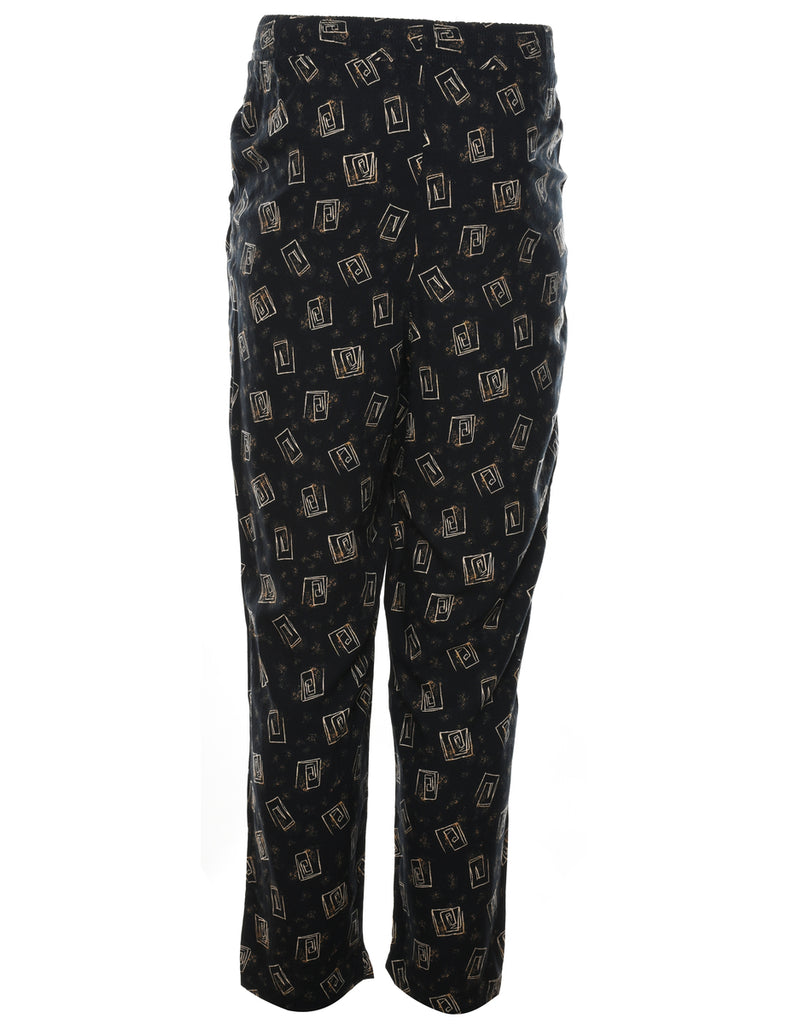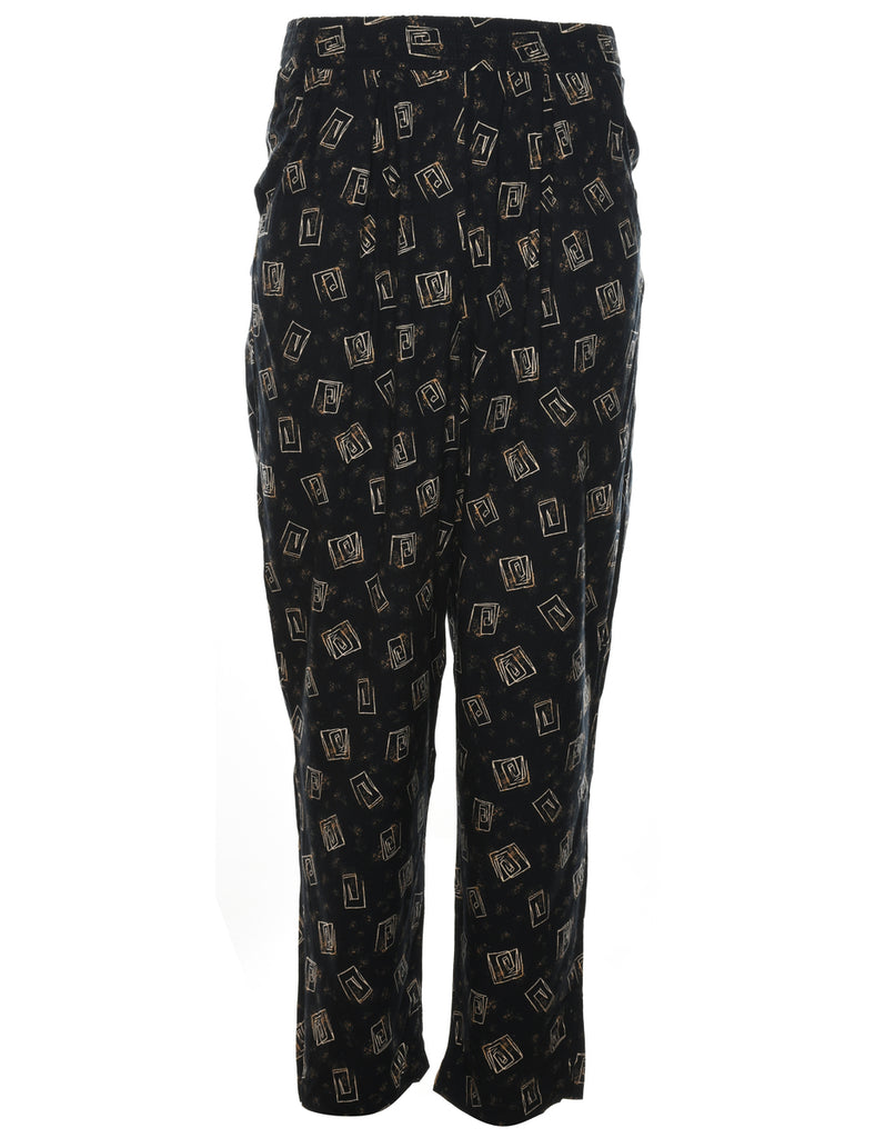 Patterned black trousers with multiple pockets and an elasticized waist.