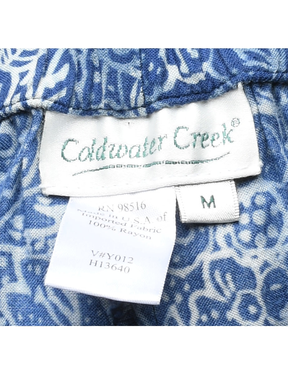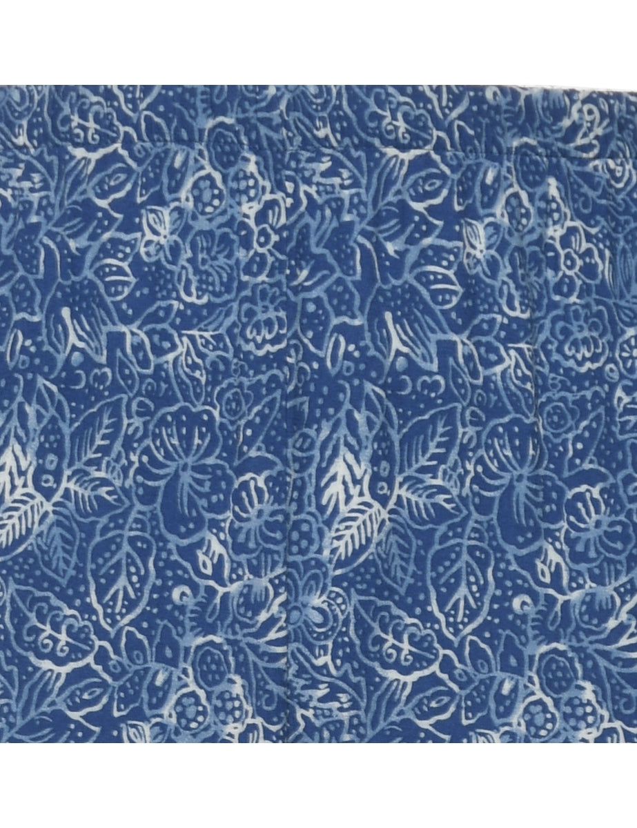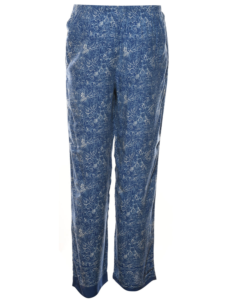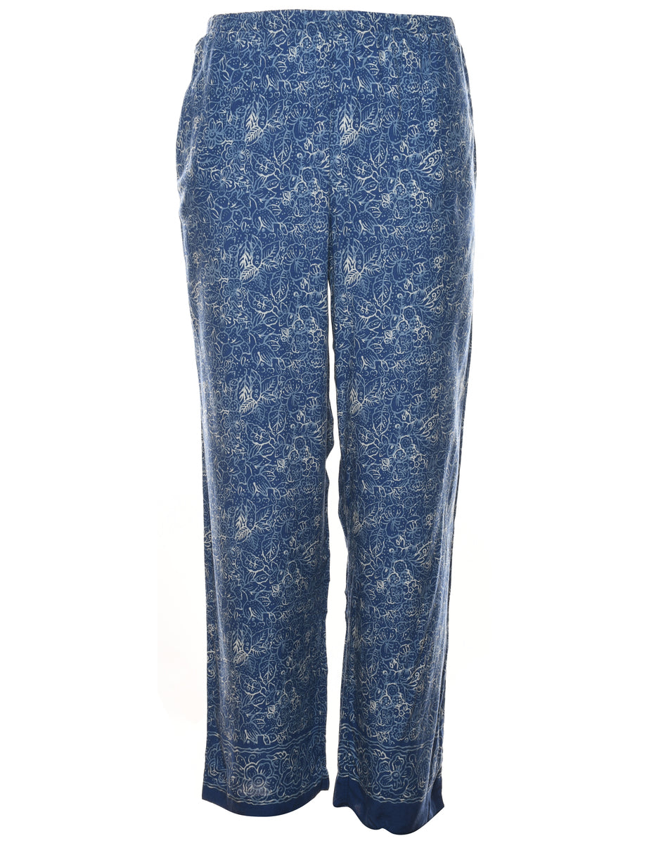 Floral print trousers. Comes in blue with multiple pockets and an elasticized waist.