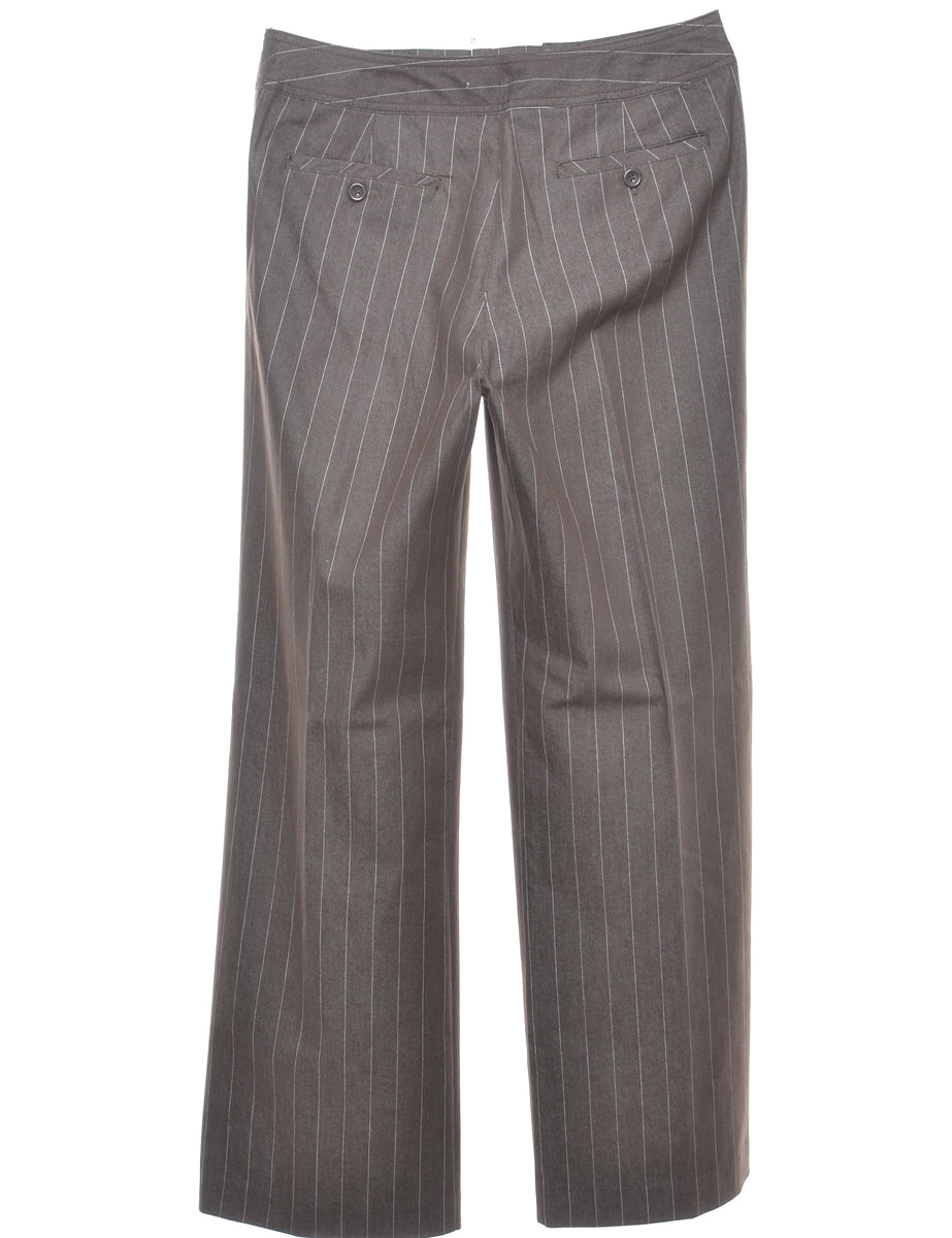 Flared leg trousers with pinstripes. Comes in dark brown with pockets.