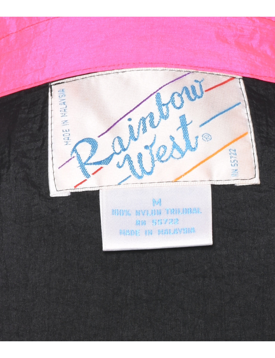 Zip front nylon jacket in black & hot pink with multiple pockets and raglan sleeves. The size label mentions M but based on the actual measurements we consider it a size L.