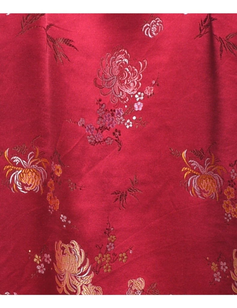 Brocade evening dress in hot pink with floral pattern, cheongsam collar and slit.