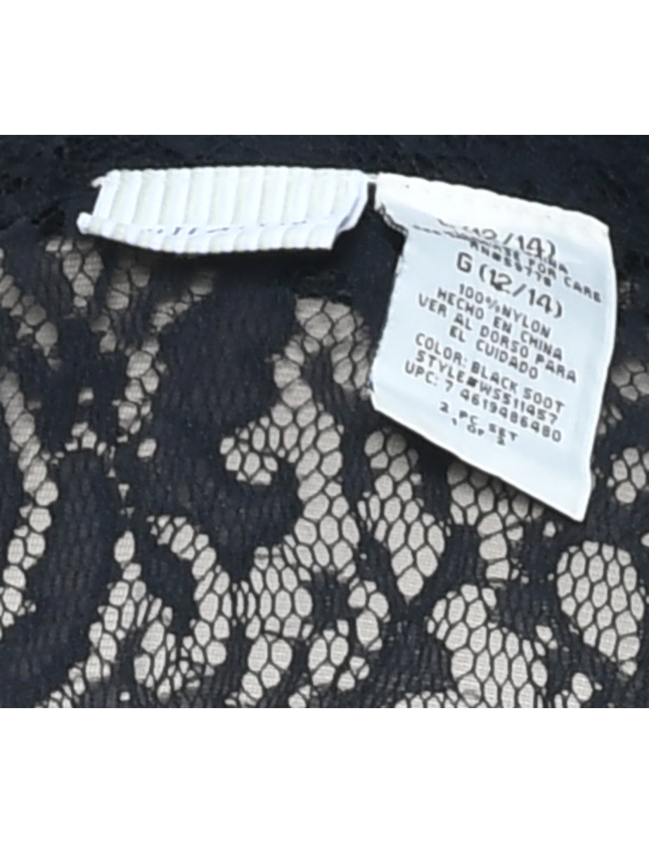 Crochet evening shirt with floral print. Comes in black with a scalloped hem.