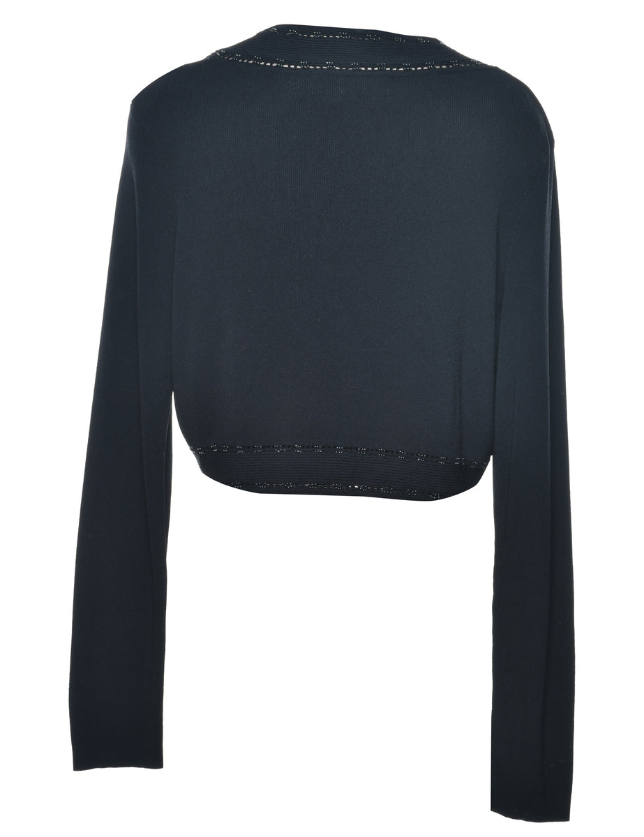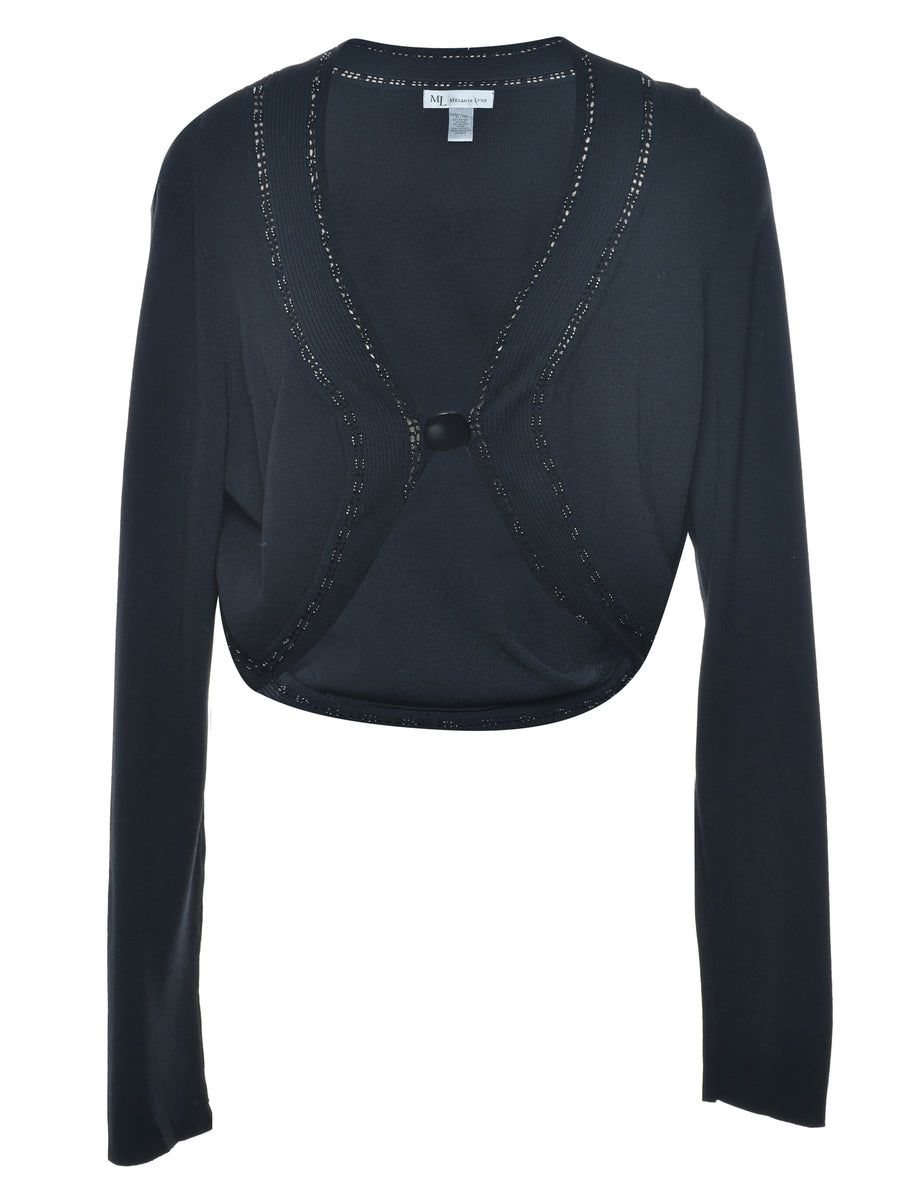 Cropped cardigan. Comes in black with beading. The size label mentions XL but based on the actual measurements we consider it a size L.