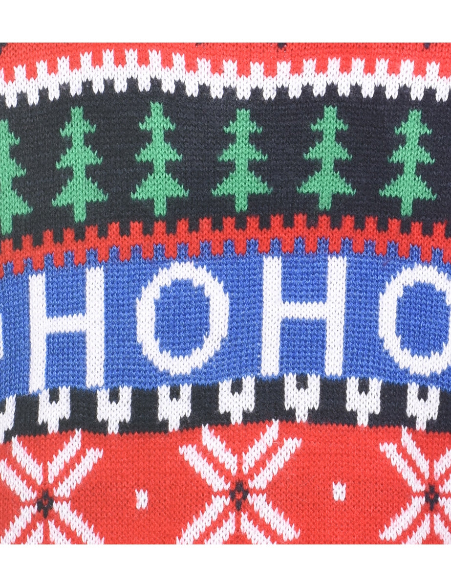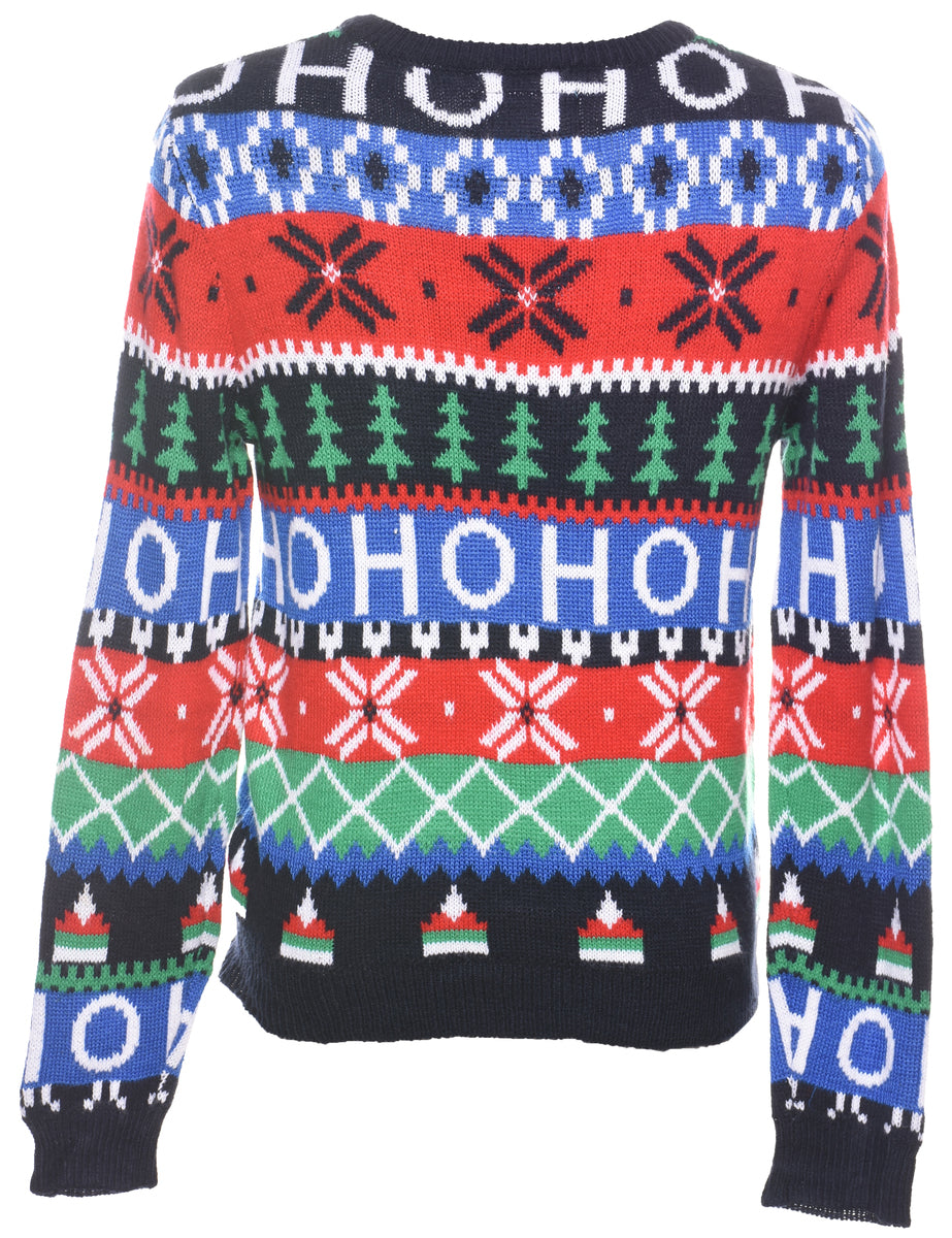 Festive season christmas jumper in multi-colour with a ribbed neck and cuffs.