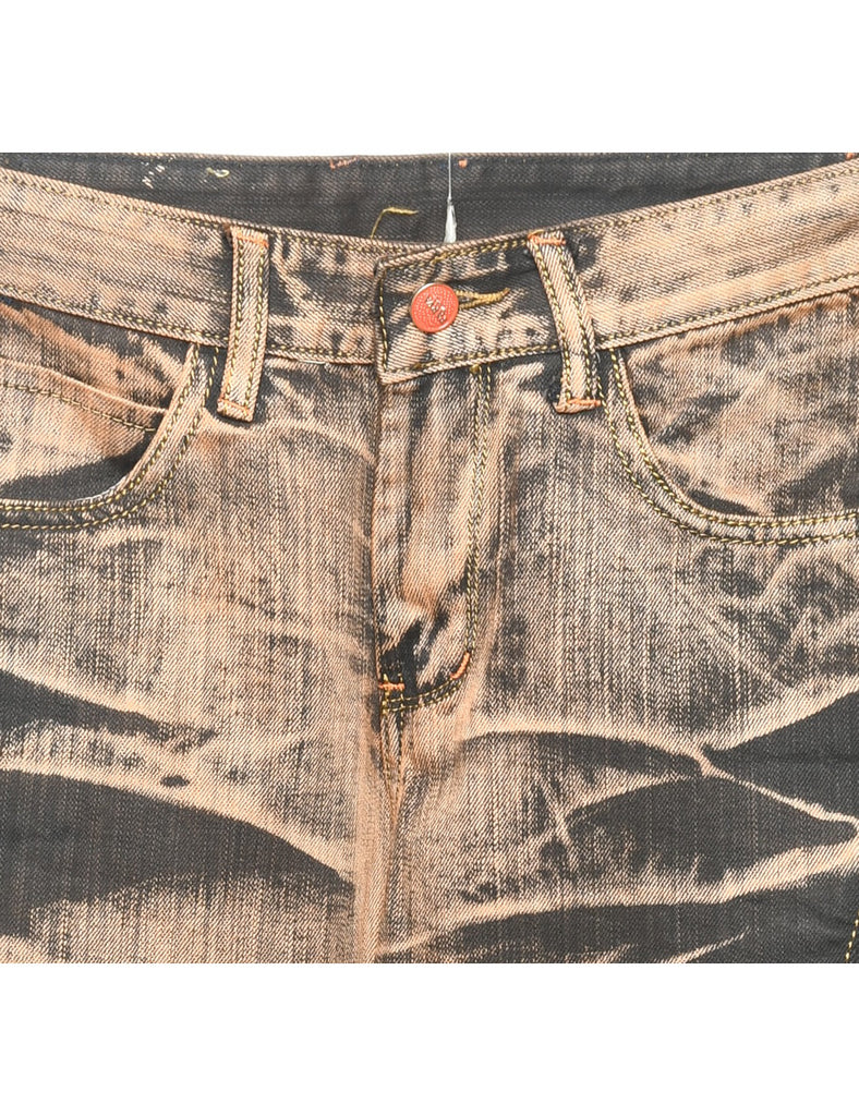 Mid rise straight fit jeans. Comes in brown with multiple pockets.