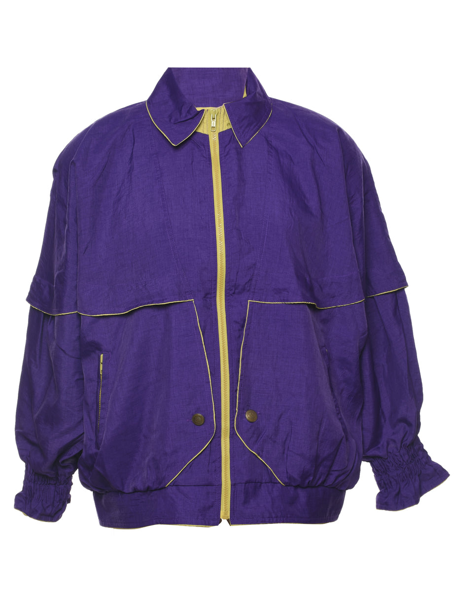 Zip front jacket. Comes in purple with multiple pockets and shoulder pads.