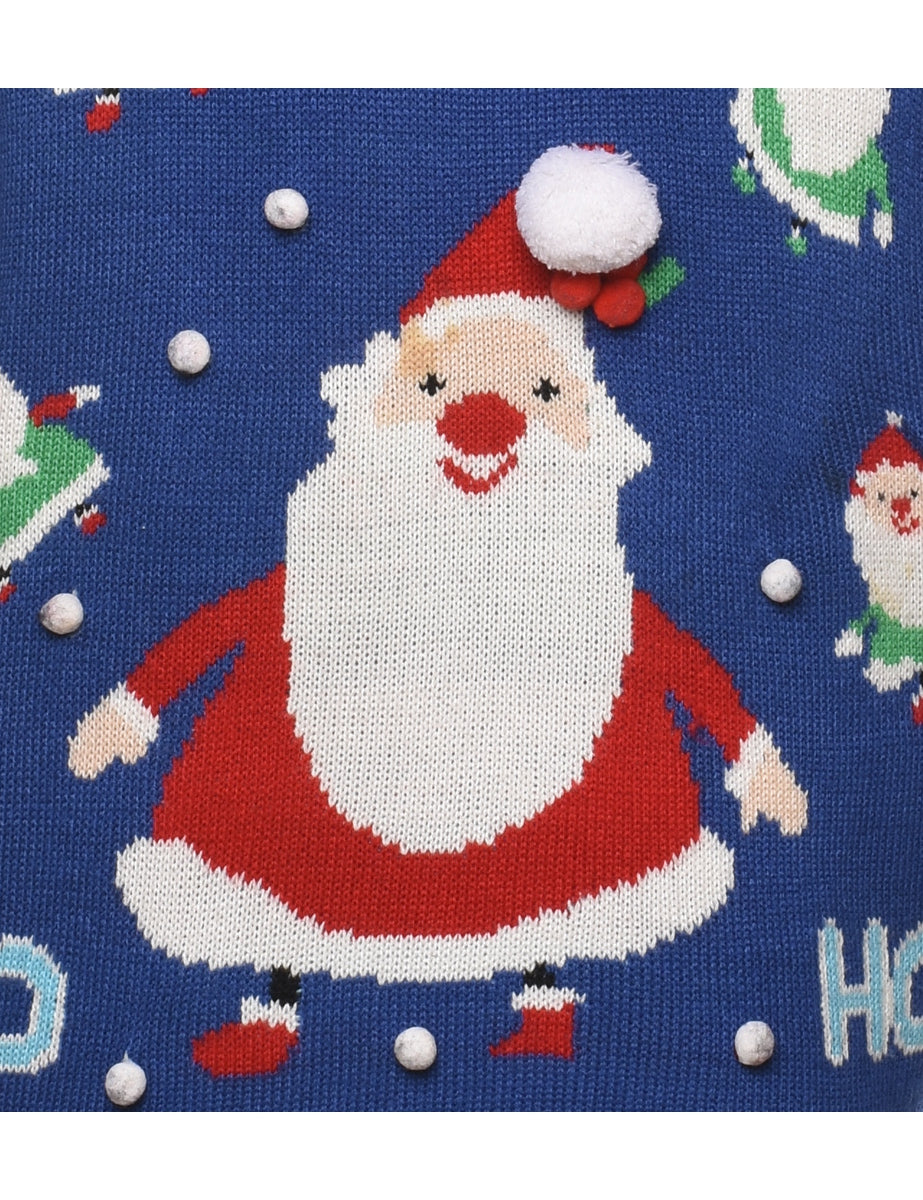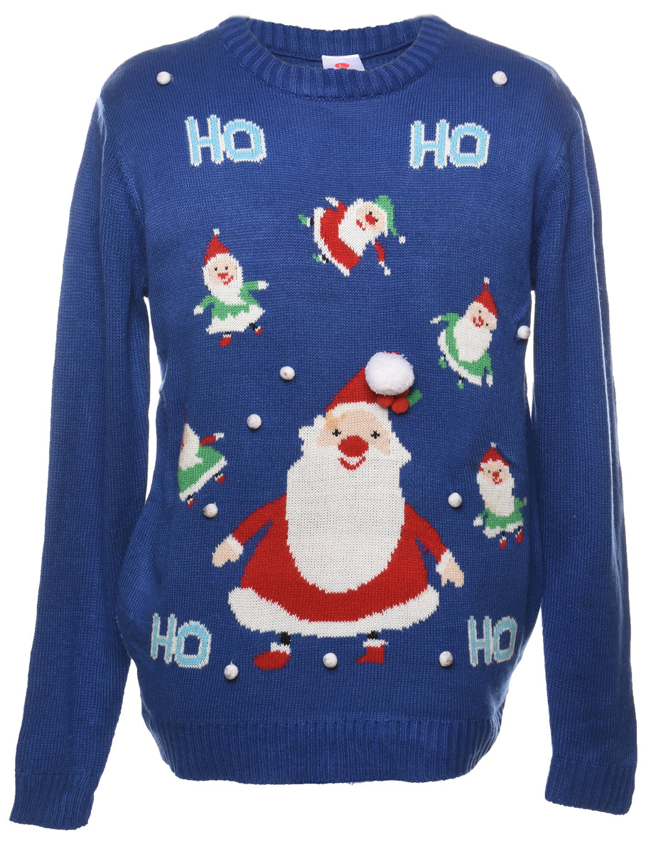 Santa claus christmas jumper in blue wit pom poms.