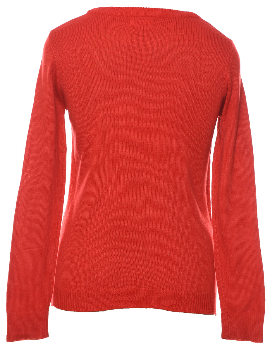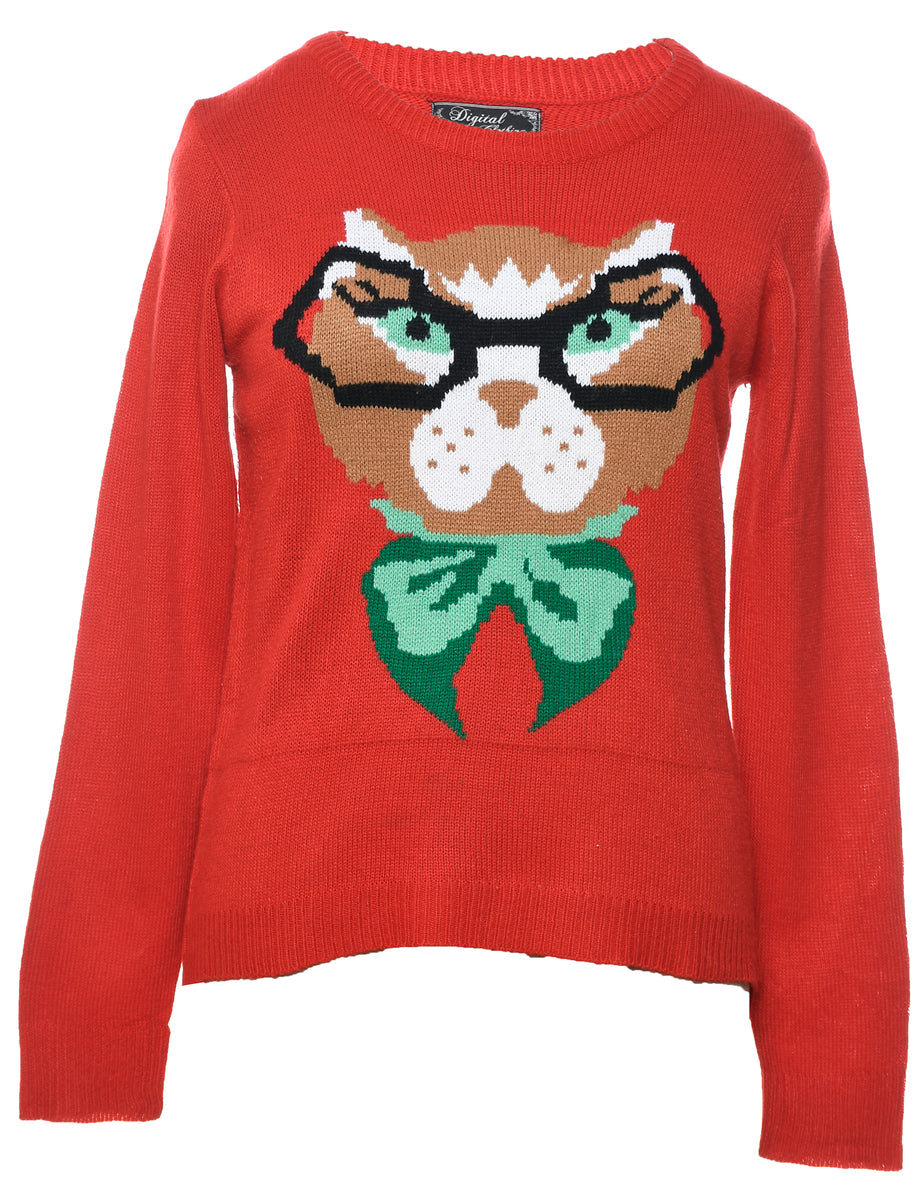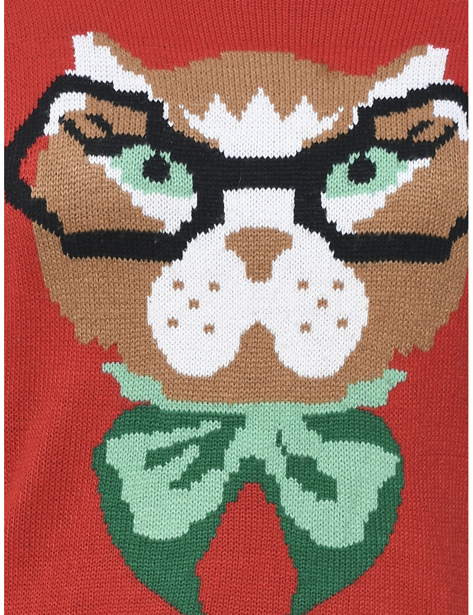 Animal design christmas jumper comes in red with a ribbed neck and cuffs.