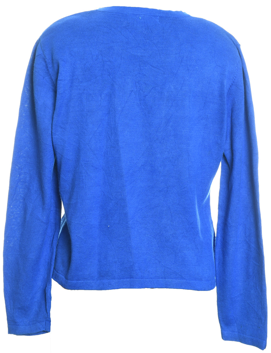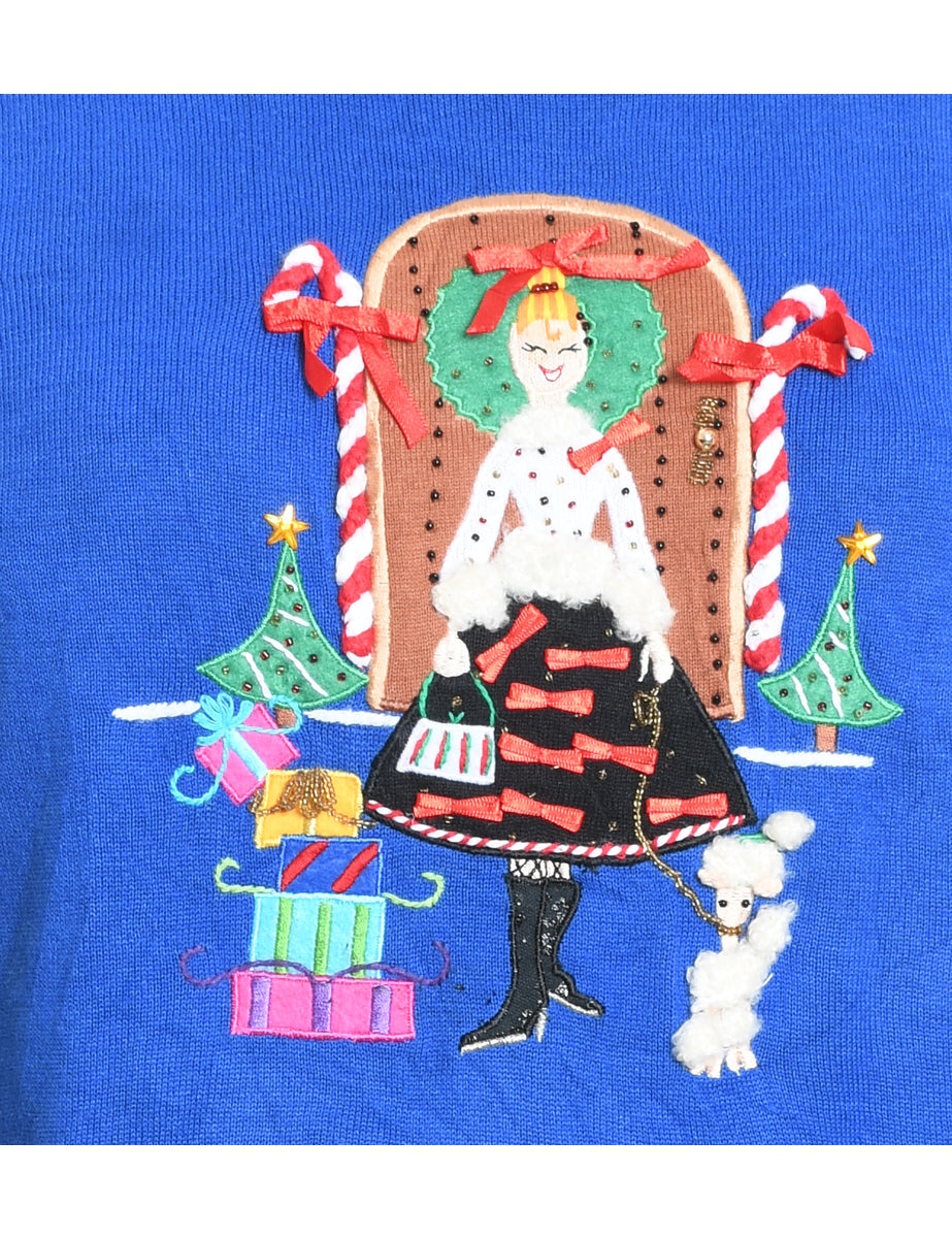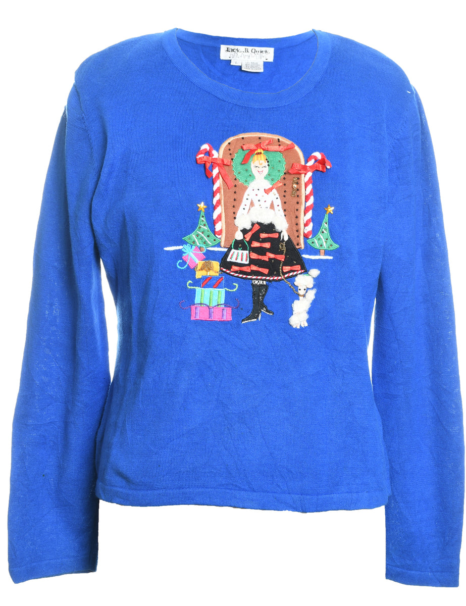 Festive print christmas jumper in blue with an applique design and removable shoulder pads.