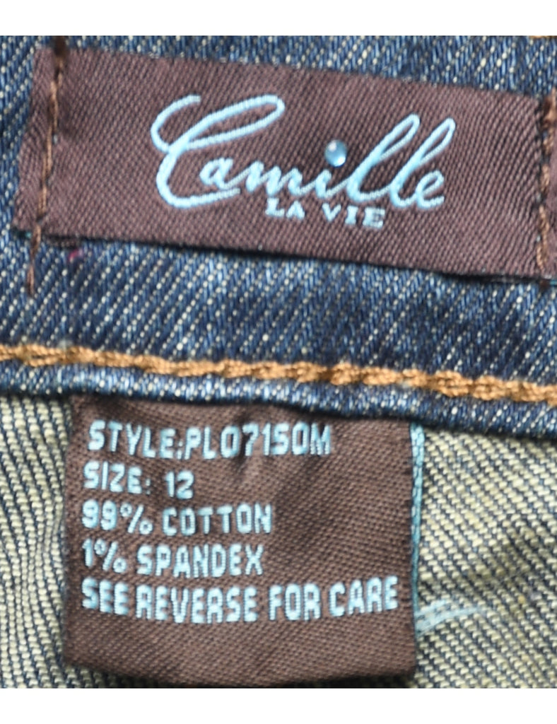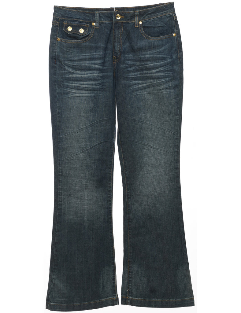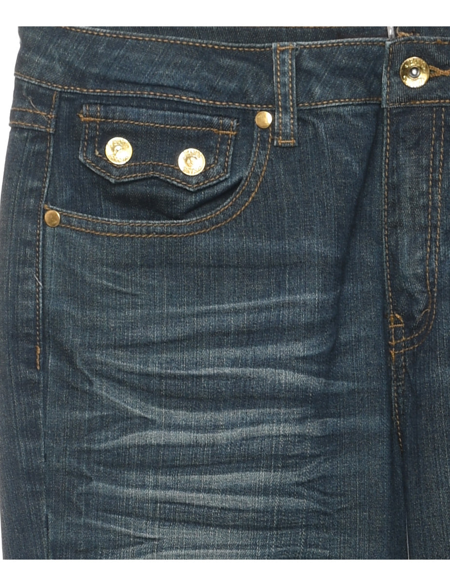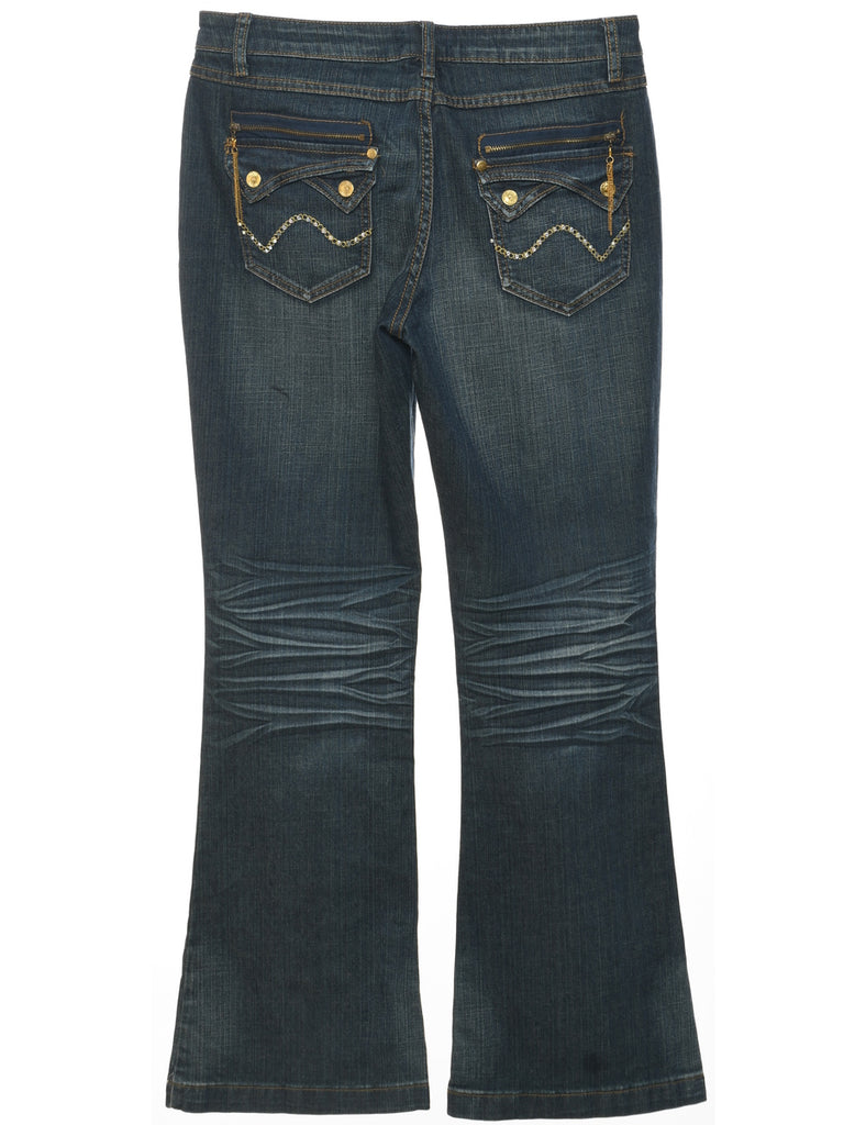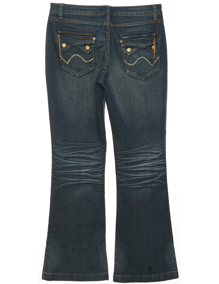 Low rise flared jeans comes in stone wash with multiple pockets.