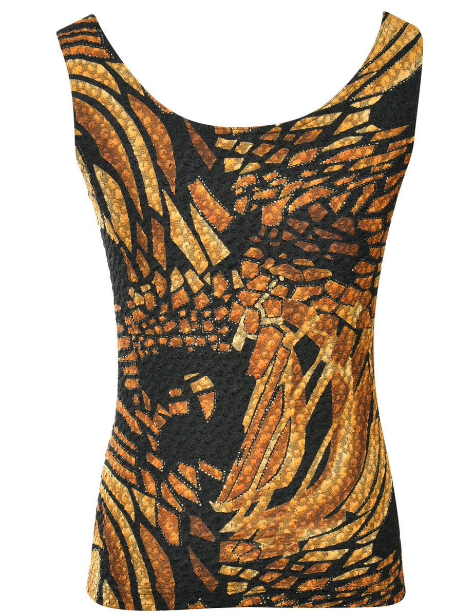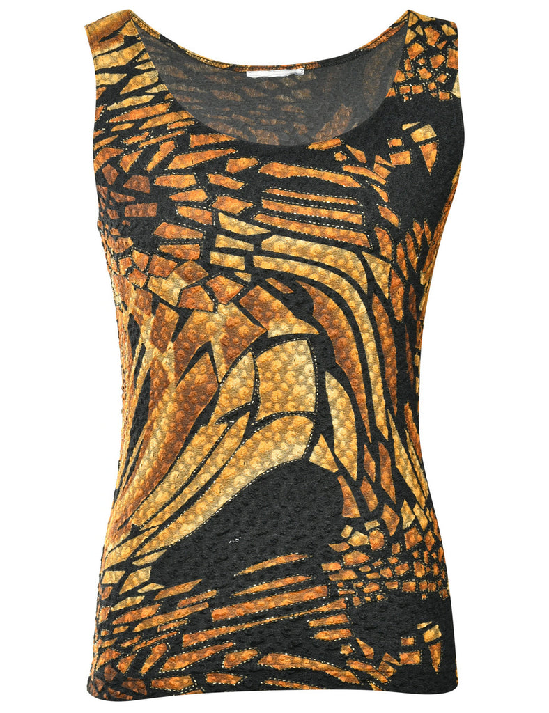Sleeveless printed top with animal print. Comes in brown & black with a round neck.