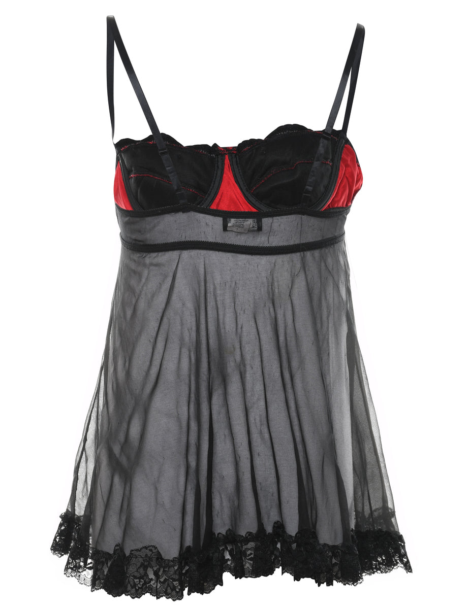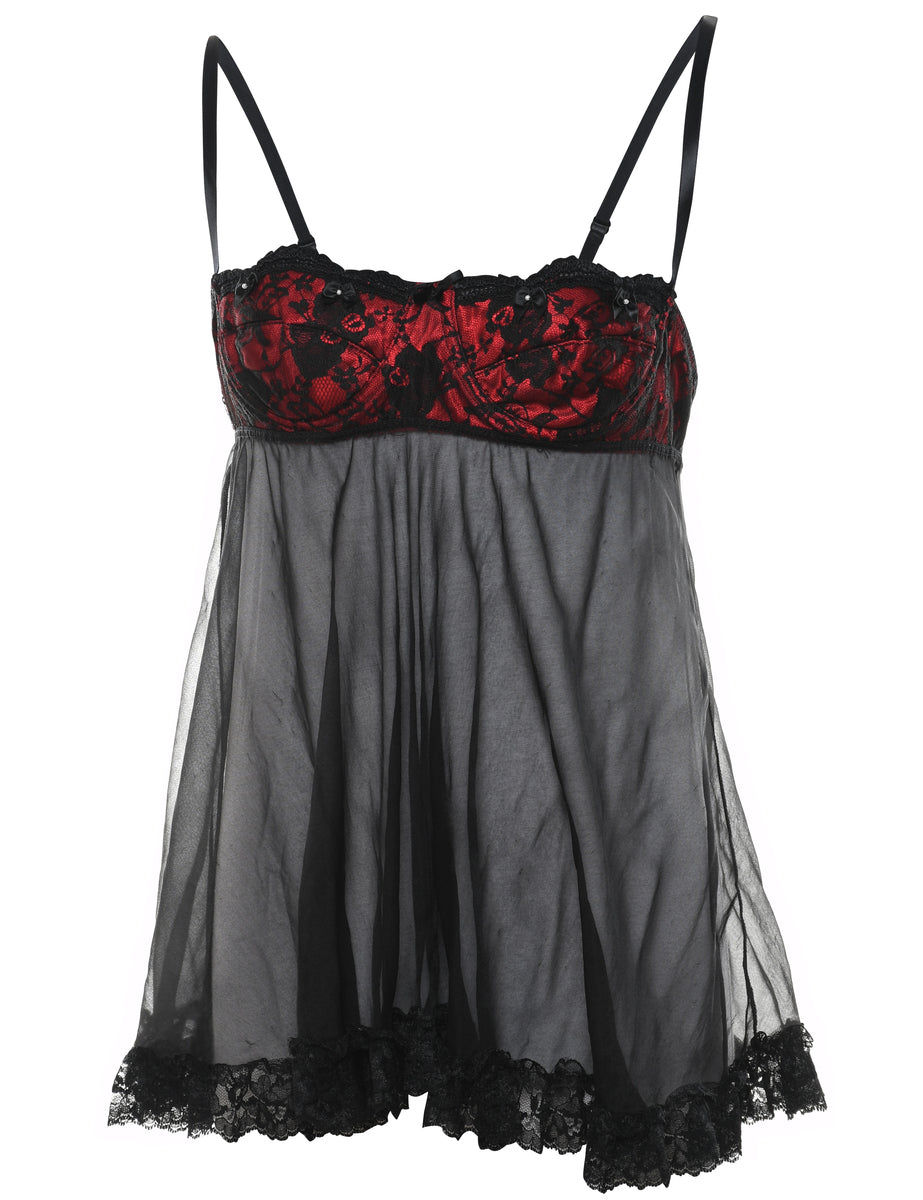 Black & red lace trim sheer babydoll complete with a boned bodice and a built-in-bra.
