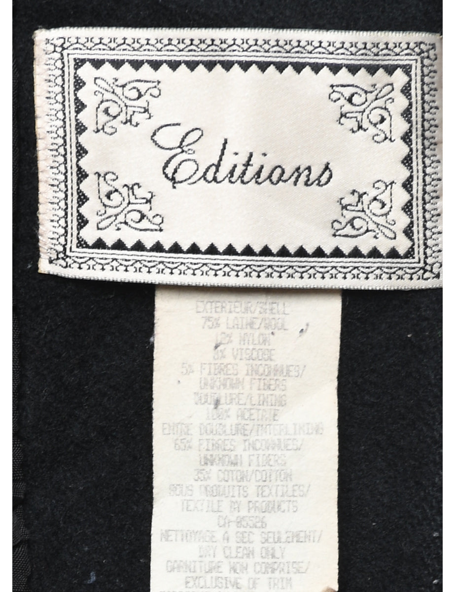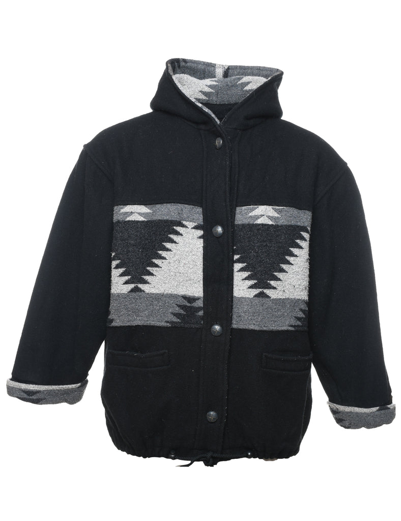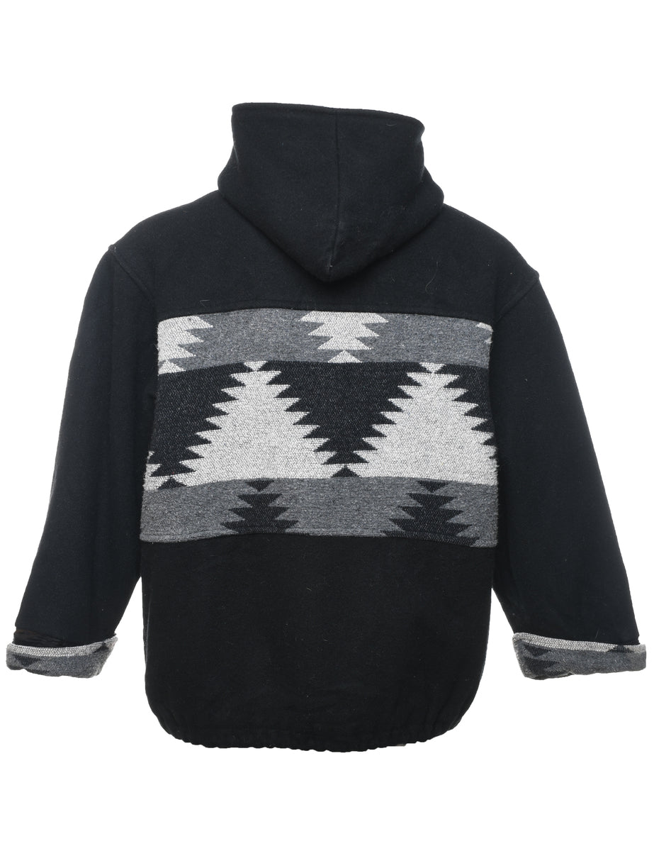 Editions hooded wool jacket with ikat pattern. Comes in black with full lining and multiple pockets.