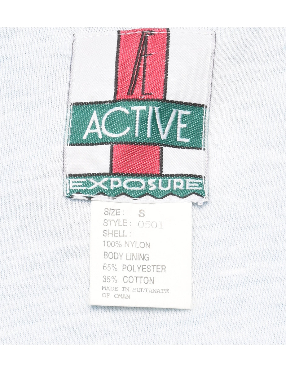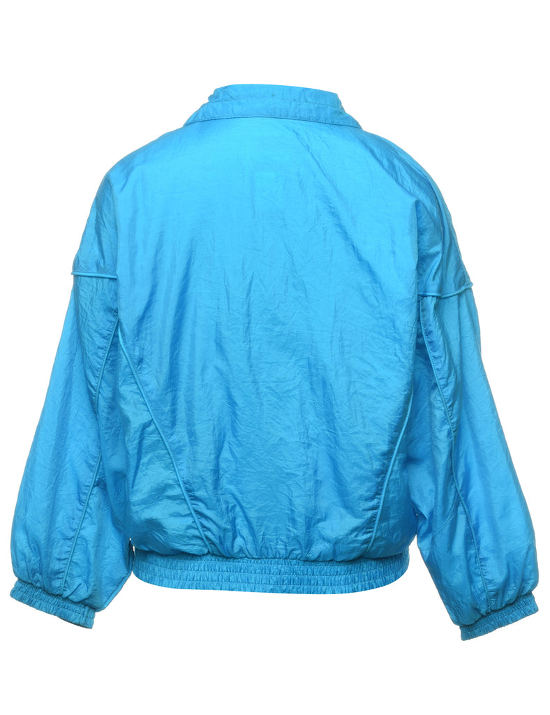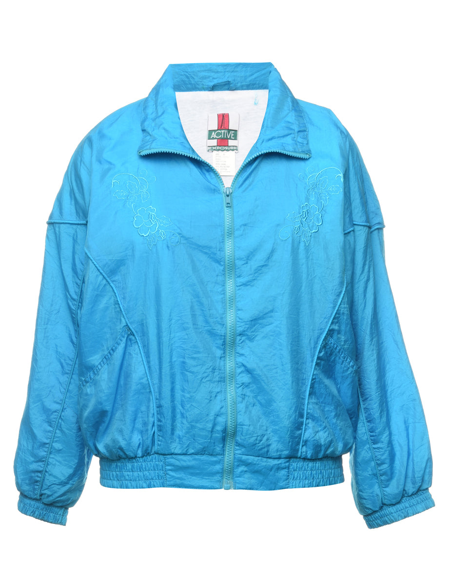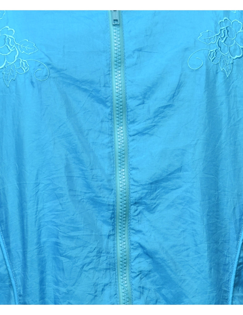 Embroidered floral turquoise nylon jacket complete with an elasticized waist and zip-front.