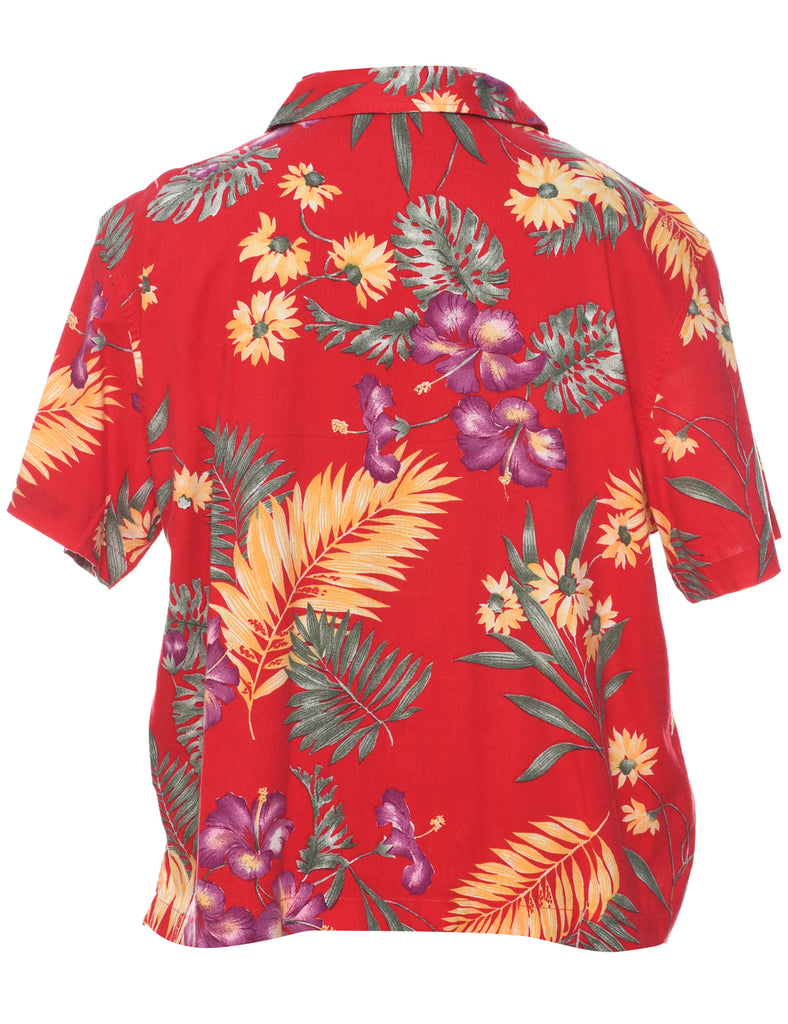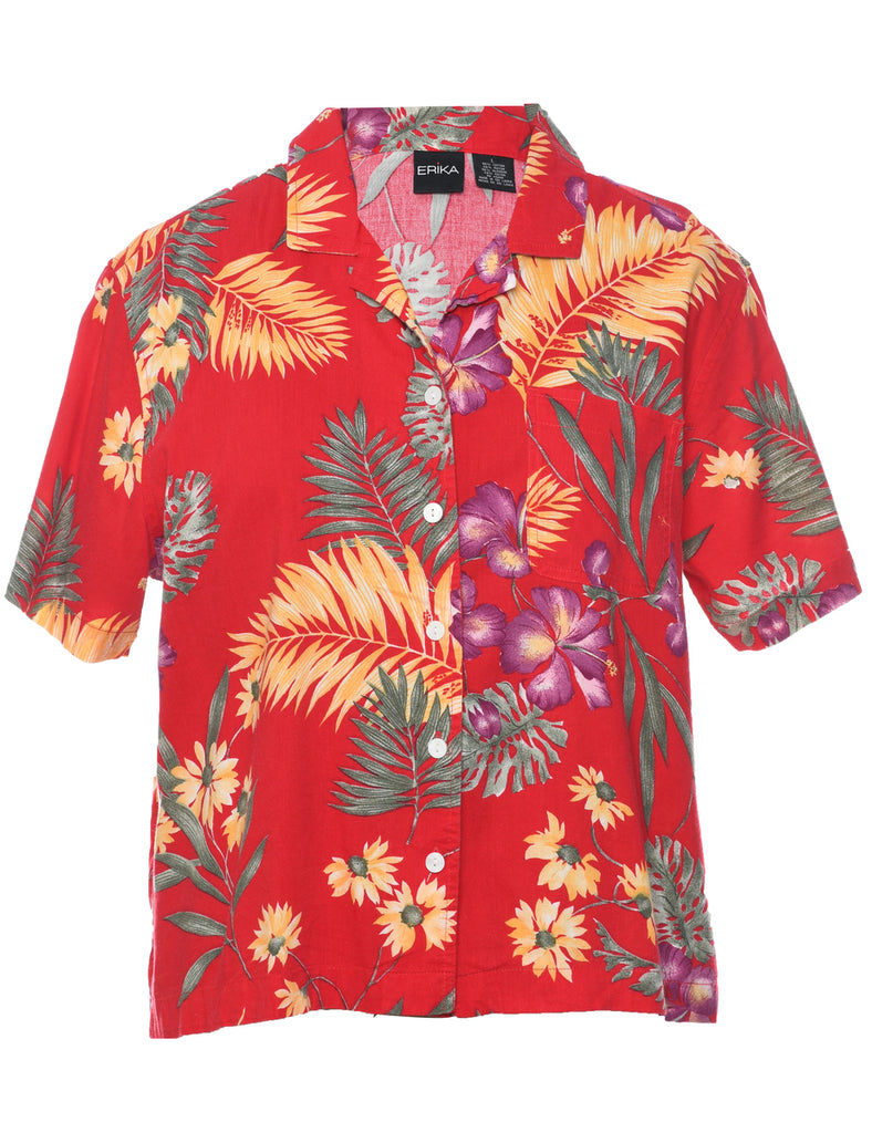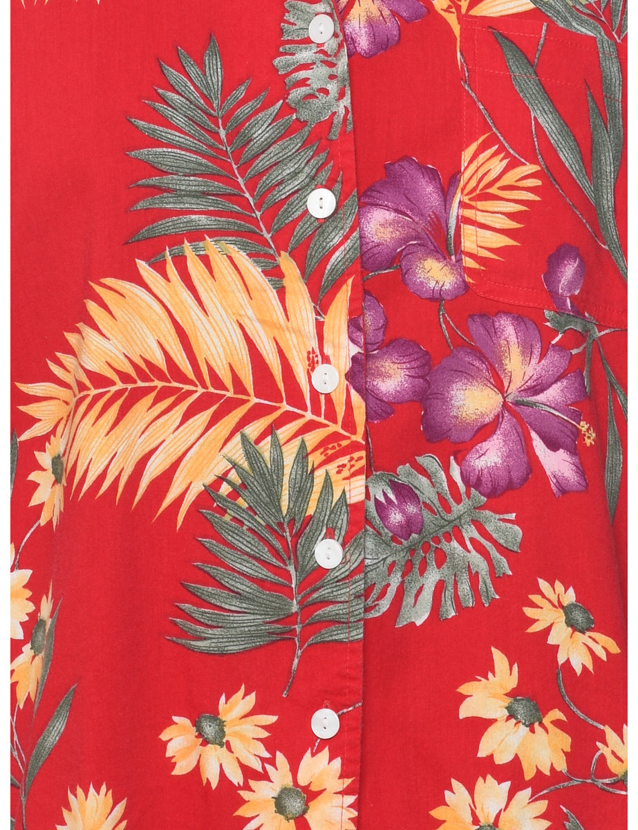 Foliage hawaiian shirt comes in red with floral print, a revere front and one pocket.