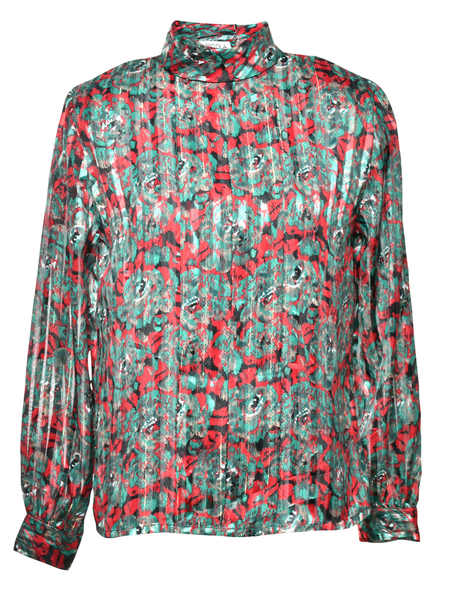 Floral multi-colour blouse with a high neck and removable shoulder pads.