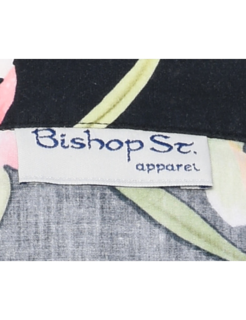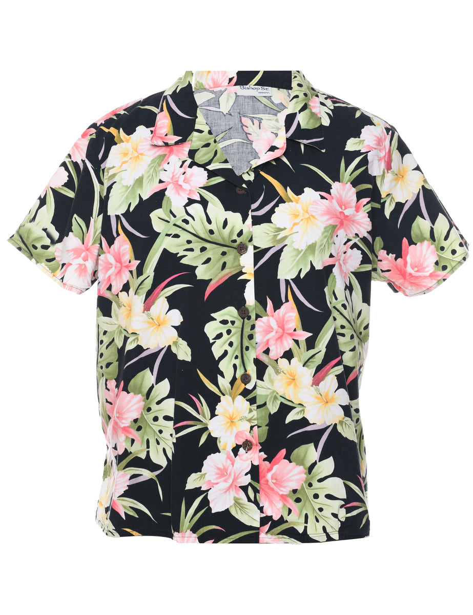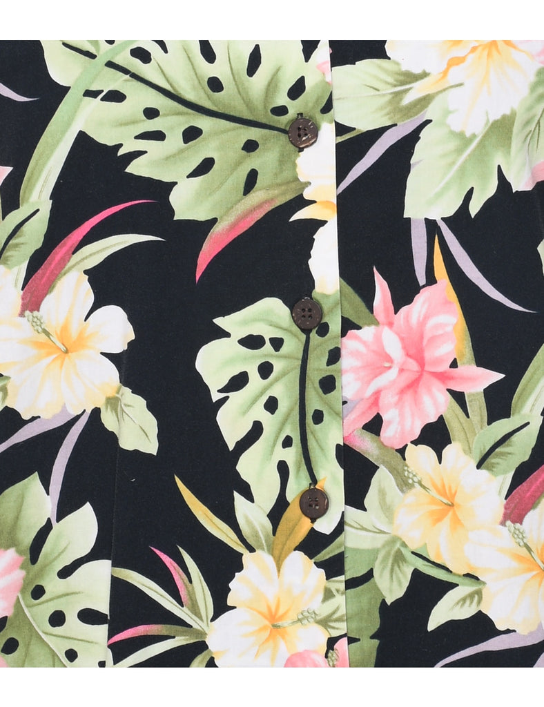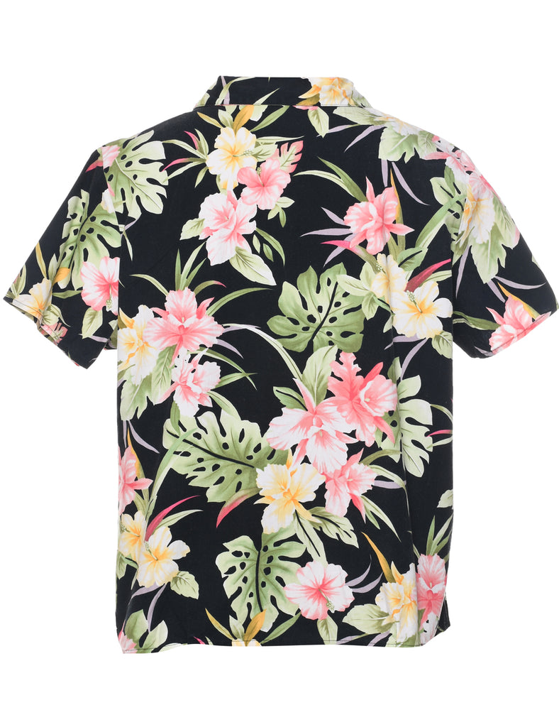 Floral hawaiian shirt with leafy print. Comes in black with coconut buttons and a revere front.